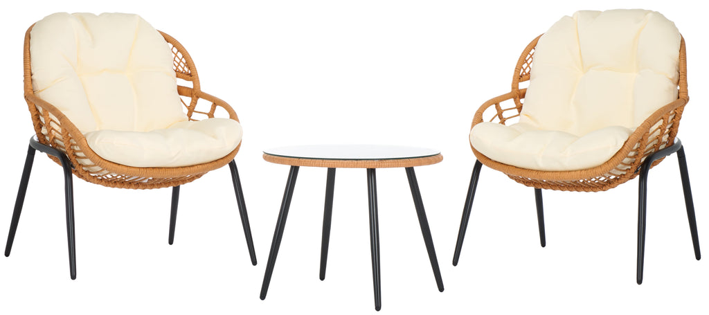 Liven up your outdoor living space with our sleek, airy, and inviting Mott 3 piece set. Including a pair of eye-catching accent chairs and a complementing side table, our set lends a dose of style and comfort to your outdoor space. It is beautifully sculpted from PE rattan to lend a fresh and airy look to any corner. The relaxed and comfy profile of the chair is accentuated with elegantly tufted beige cushions to offer a comfortable stay. Perched upon powder-coated steel legs, our living set easily blends and complements your patio, backyard, or living space. It offers easy care and maintenance to serve you for years to come.