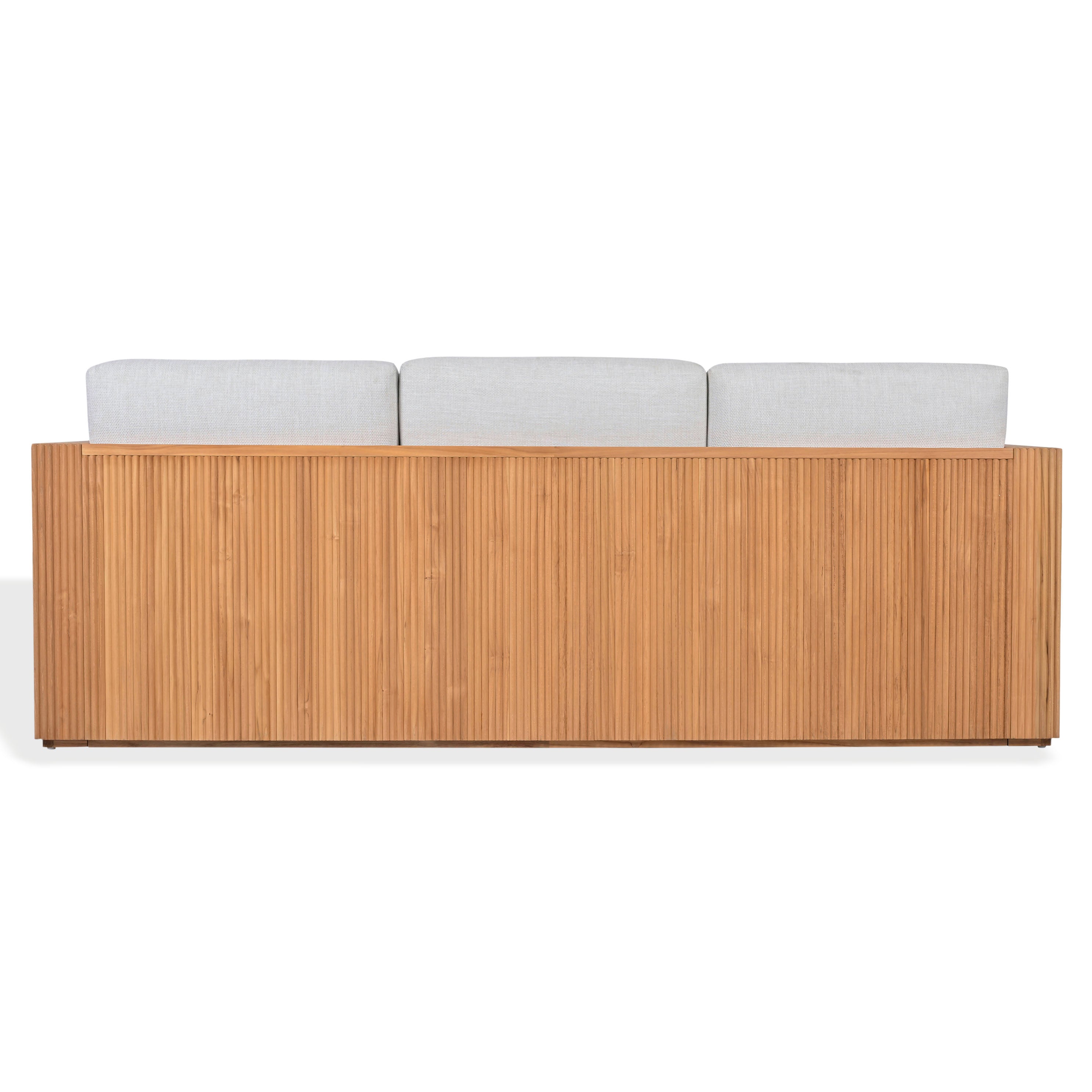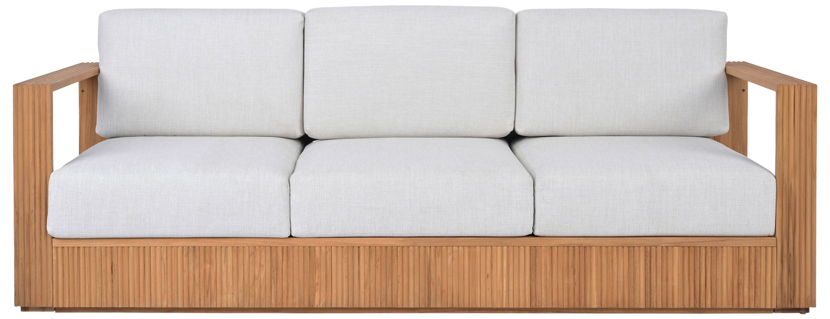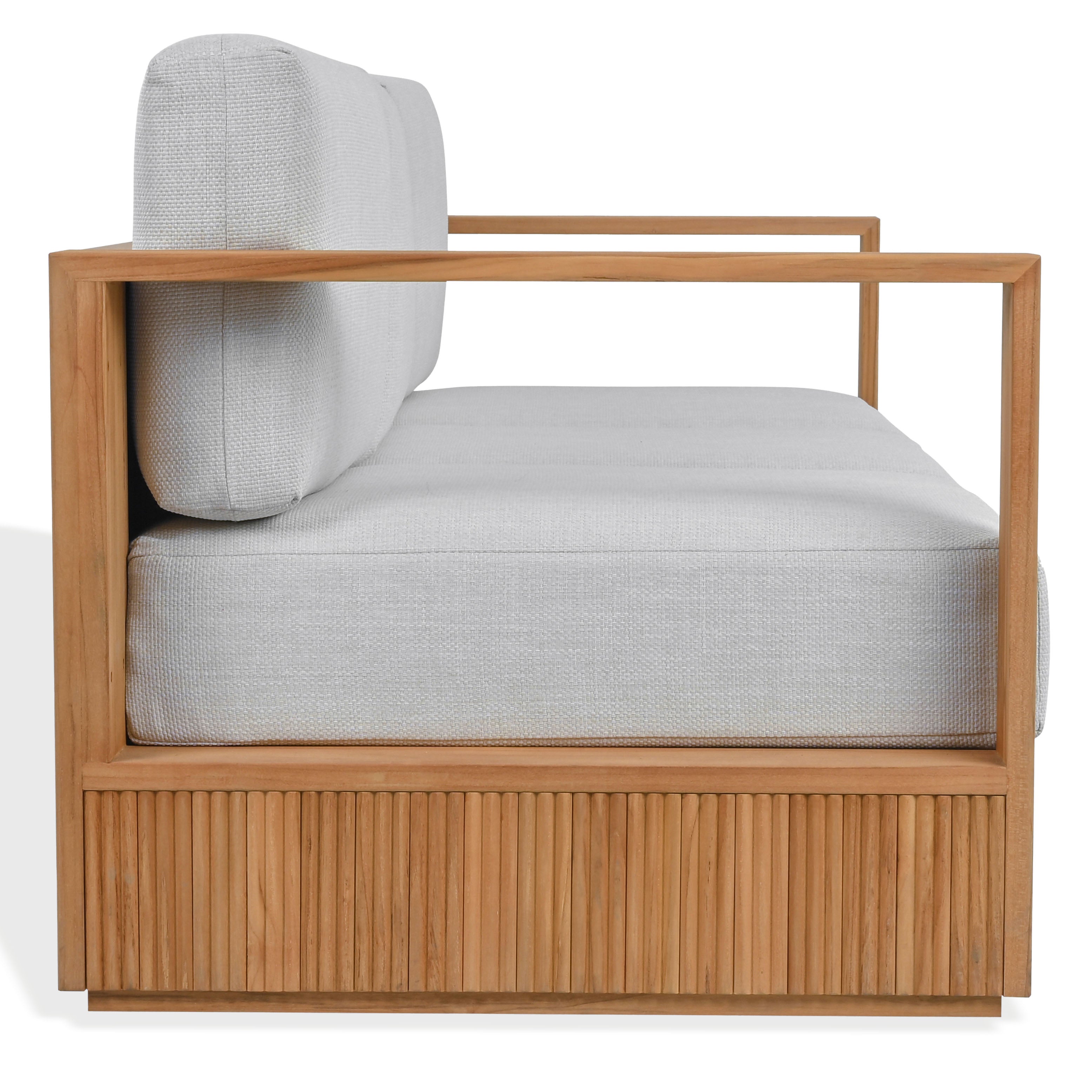 Transform your outdoor space with the Saint Lucia reeded teak wood patio sofa in natural and white. This elegant piece combines style and comfort, making it the perfect addition to your patio or garden. Crafted from beautifully textured teak wood, the sofa exudes an inviting charm that complements any outdoor setting. Its natural tones blend seamlessly with the white fabric, creating a harmonious look that catches the eye. Bring a sense of serene relaxation to your outdoor gatherings or quiet moments alone. The Saint Lucia reeded teak wood patio sofa is more than just a seat, it is an enhancement to your outdoor lifestyle.