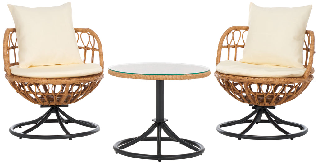 Make a chic and breezy statement outdoors with our Colby 3 piece set. Featuring a stunning pair of accent chairs and a side table, our outdoor set enables you to lounge and relax in style. The voluminous silhouette of the chair is crafted from PE rattan to attain a breezy and sculptural presence. Its hugging back is complemented with back cushions and a padded seat to offer a dose of comfort. Elevated upon a steel swivel base, the accent chairs allow for lingering conversation and a perfect view. It offers easy care and maintenance to give a stylish and long-lasting refresh to your patio, balcony, or backyard.