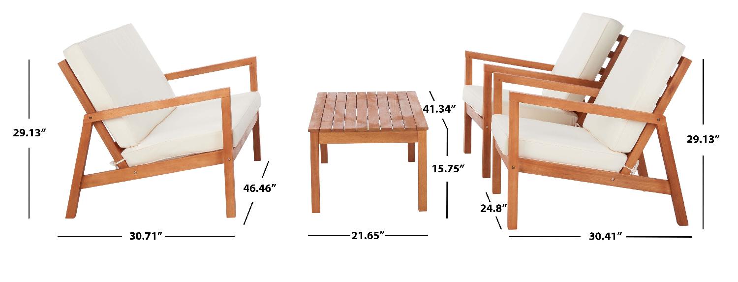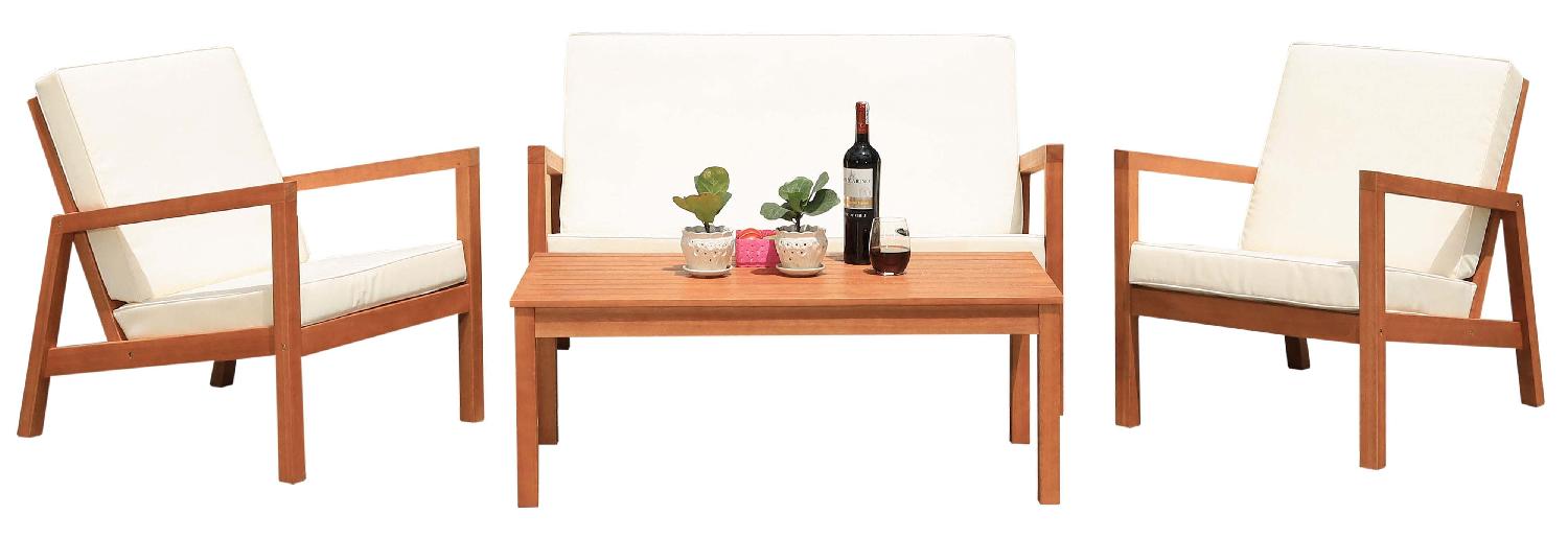 Fun and functional, this 4 piece outdoor living set was designed for versatility and value. Crafted with natural eucalyptus wood, its coffee table, inviting settee and two deluxe chairs feature clean lines and plush cushions to create a relaxing oasis.