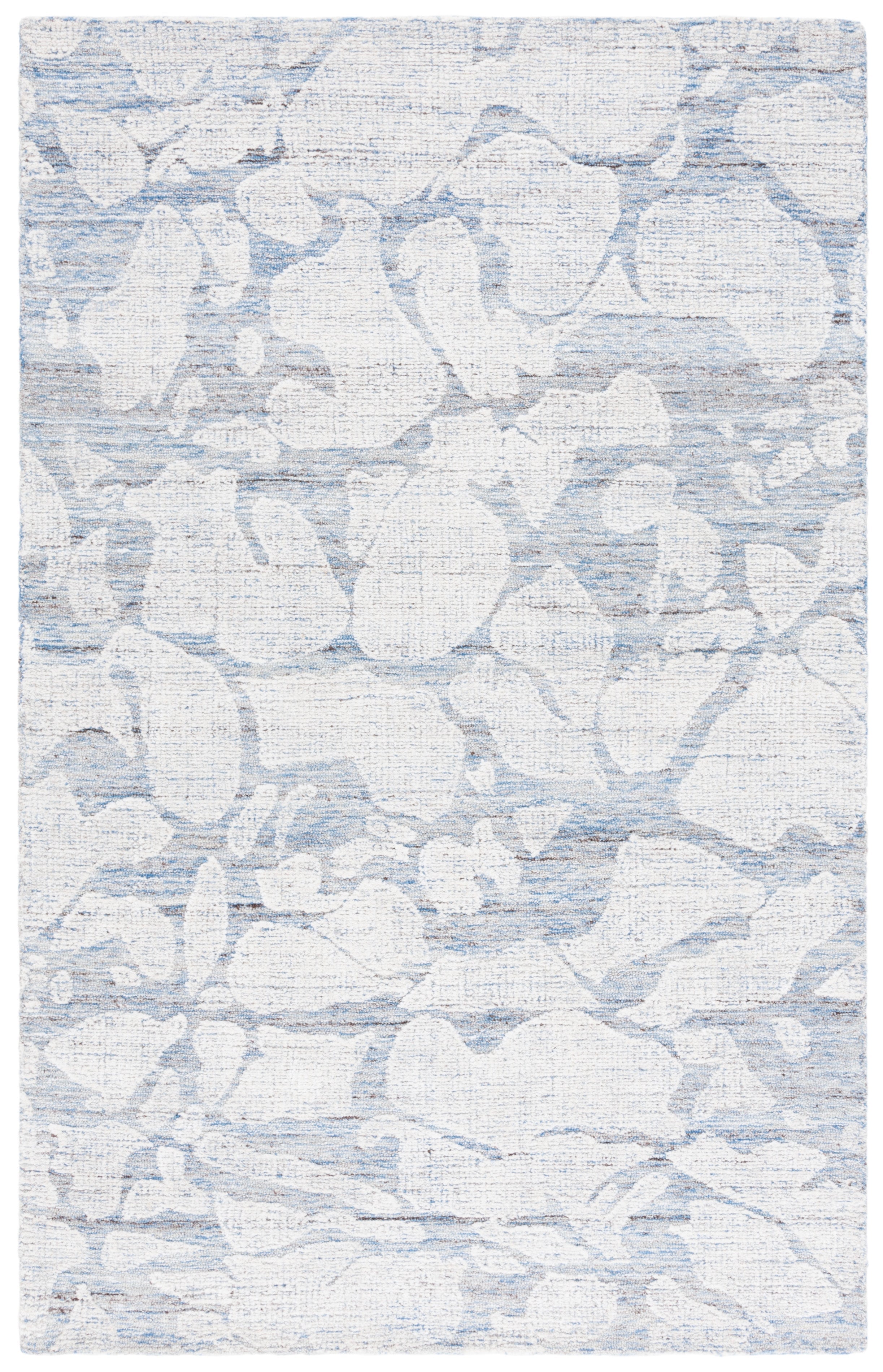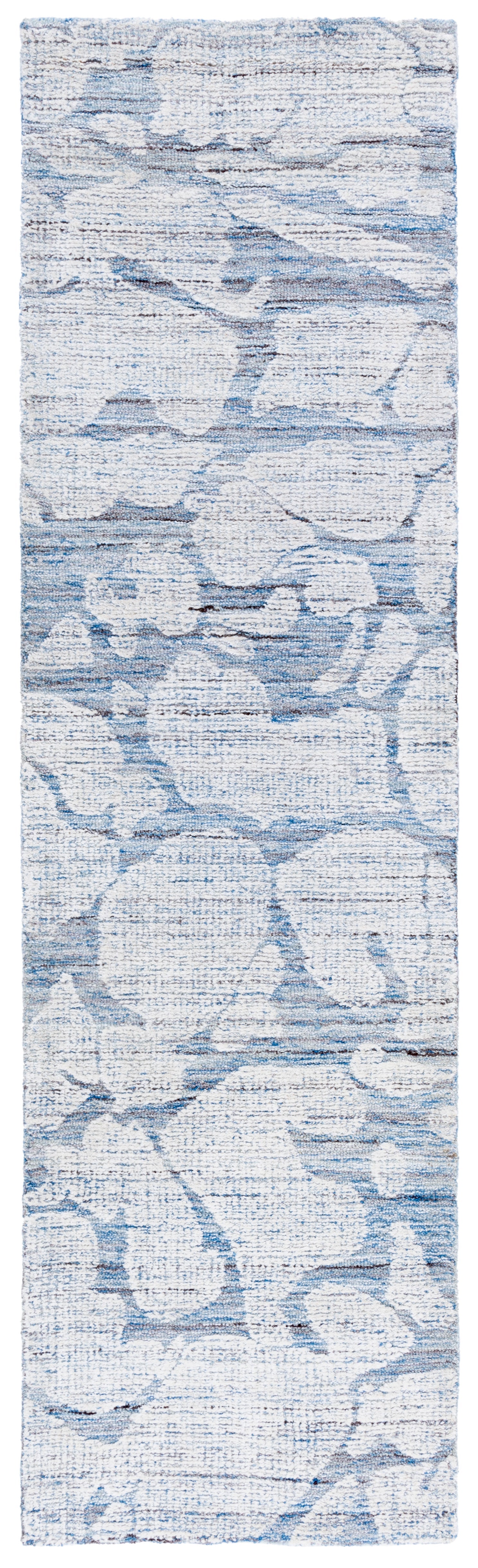 The modern style is beautifully complemented by a sophisticated pattern that plays with abstract floral motifs and organic shapes, rendered in a harmonious blend of blue tones against an ivory backdrop. The serene color palette and fluid design make this runner an ideal choice for contemporary interiors seeking a refined accent piece.