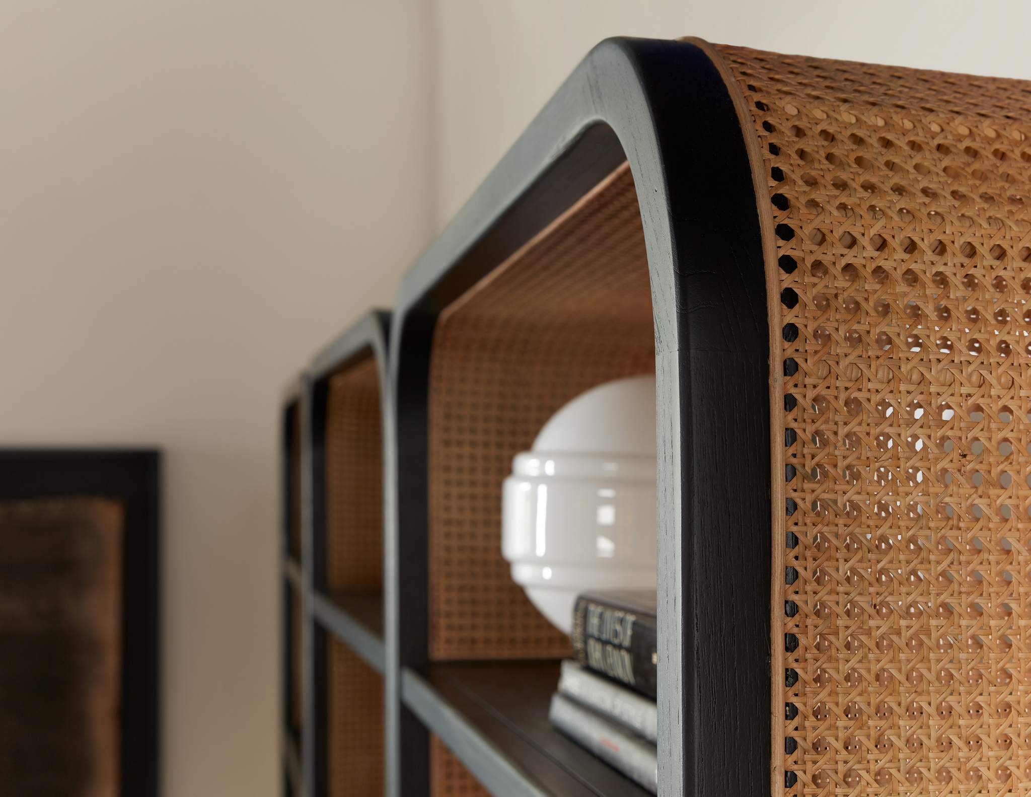 Inspired by modern and tropical influences with a dash of mid-century nostalgia, the Cain Bookcase is crafted of Red Oak Veneers, Rattan and Cane. The wood frame has a black finish, and the brown Cane exterior goes all the way around the outside. Measuring 40 inches wide and 16 inches deep, the bookshelf has four fixed wood shelves.