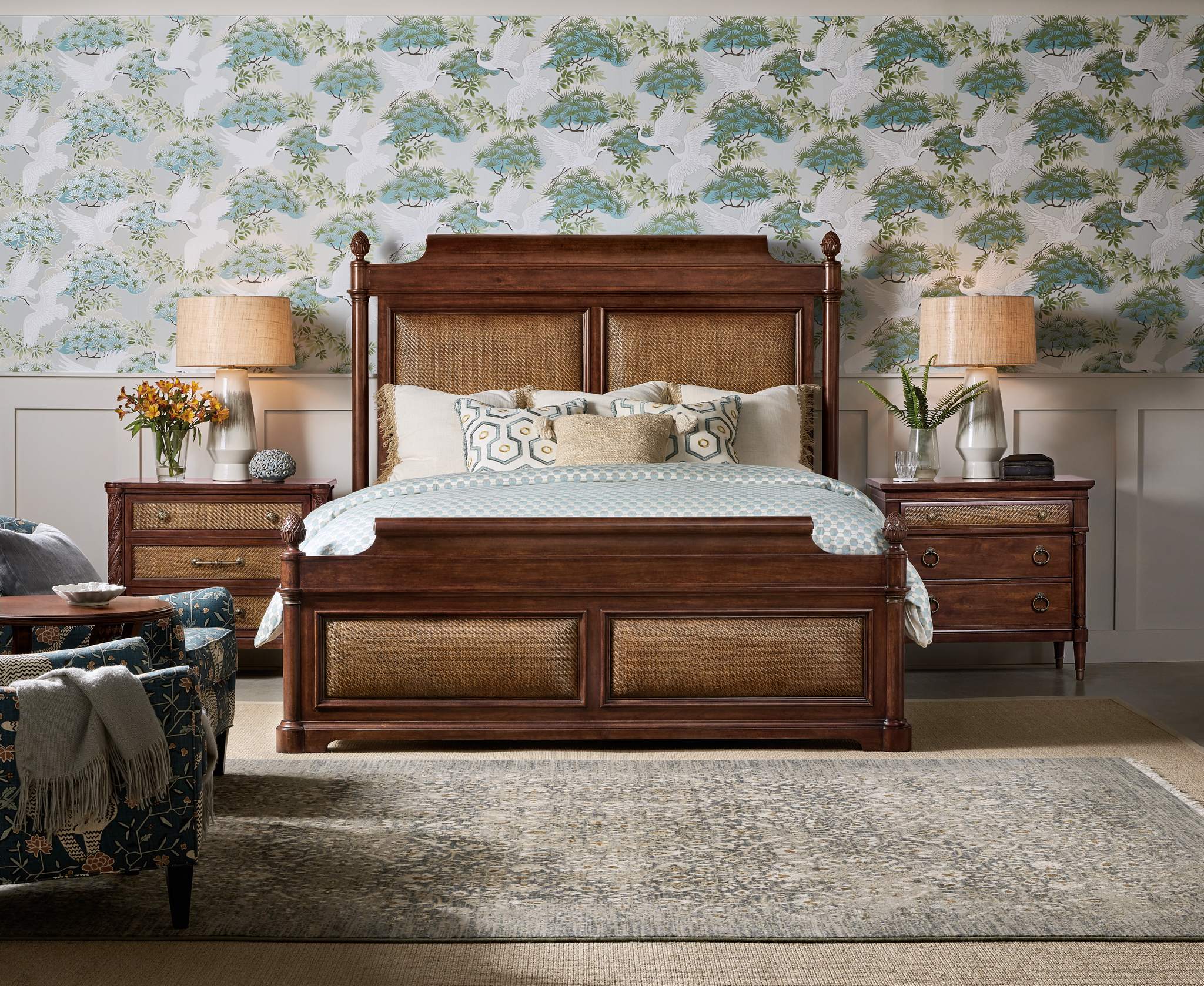 The tropical craftsmanship and botanical carving of the West Indies meets southern hospitality and grace with this stunning Charleston California King Panel Bed. Crafted of Cherry and Walnut Veneers with Walnut Inlay and Cane, the bed has raffia panels on the headboard and footboard, and pineapple finials on the low posts. The bed is finished in Maraschino Cherry using natural grain Cherry Veneers with dramatic cathedral structure and naturally-occurring knots to deliver a rich warm cherry finish and a smooth sophisticated aesthetic. Headboard can be used alone.