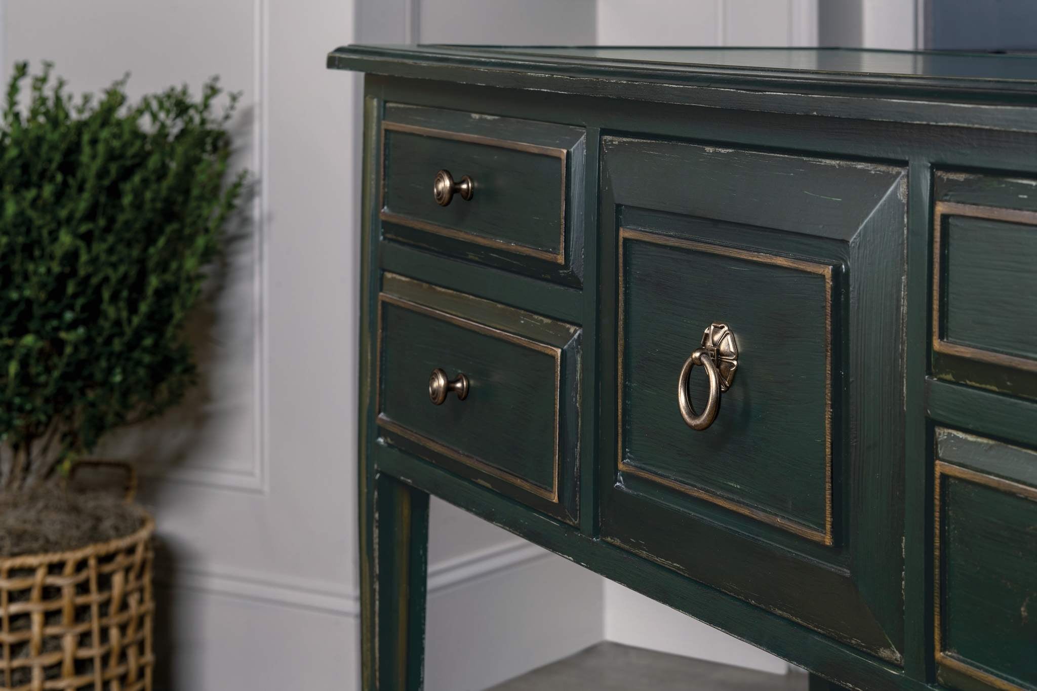 The vintage charm of the coastal South meets the traditional soul of the Federal and Georgian design period with the Charleston Five-Drawer Console Table. Featuring tapered legs and accent highlights, the five self-closing drawers on the chest are finished in a cherry color on the interior. Crafted of Maple Veneers, the table is finished in Charleston Green, a weathered interpretation of the classic dark, almost black, green that adorns trim, shutters and doors across all the historic district of Charleston. The knob and ring pulls are in an antique pewter color.