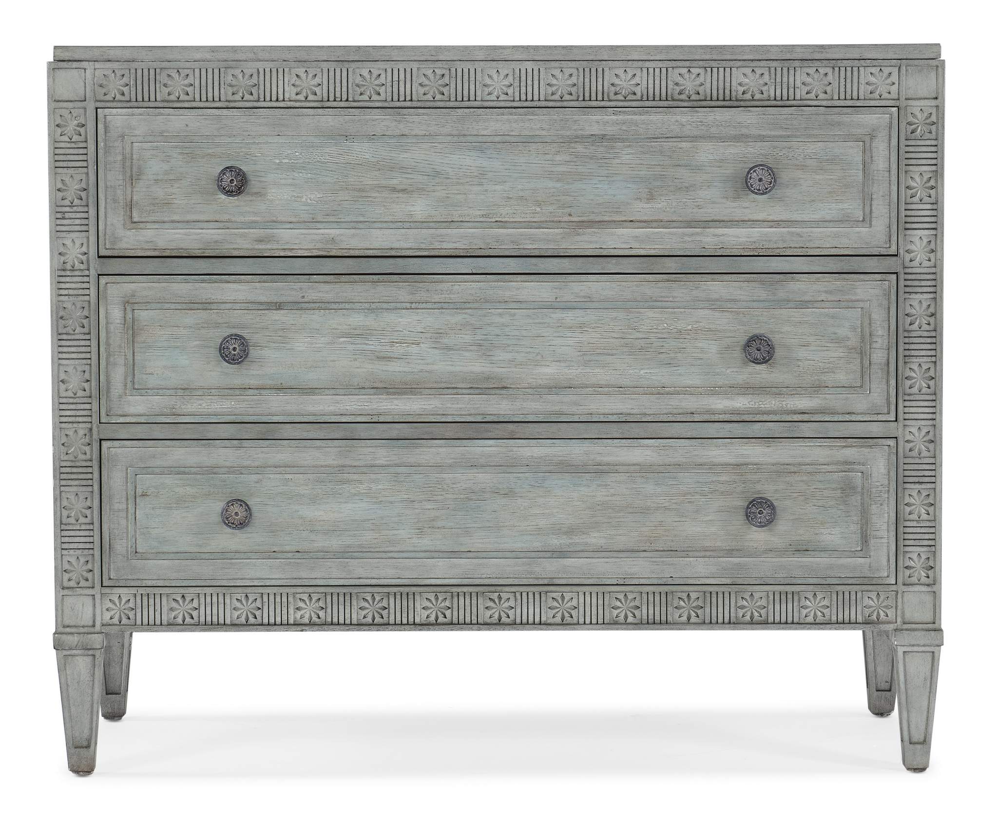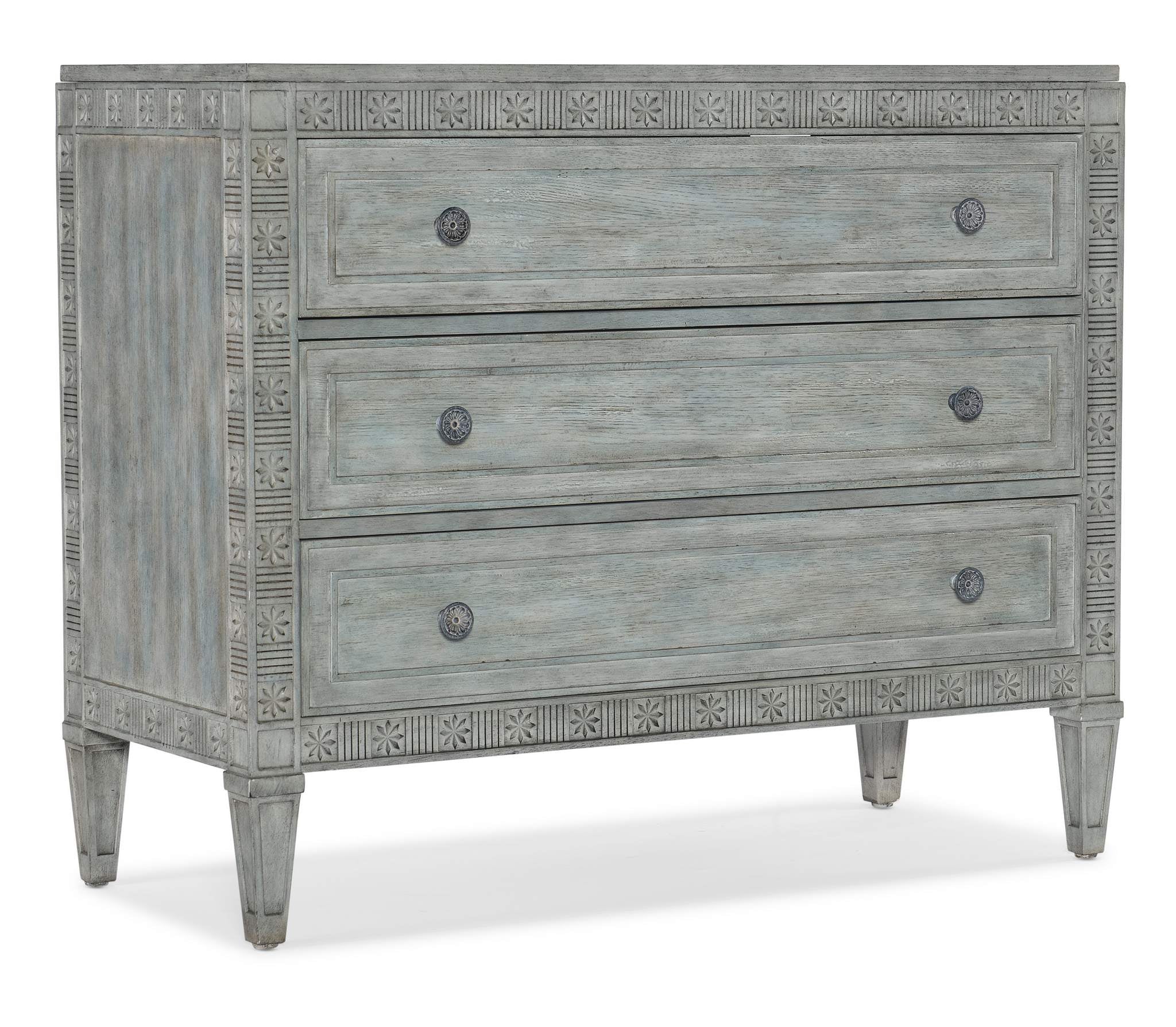 Capturing the vintage charm of the coastal South, the Charleston Three-Drawer Accent Chest has carved floral fretwork accents and tapered legs. Crafted of Maple Veneers with a Solid-Wood Edge top, it is finished in Waterscape Blue, a transparent blue-green coloration allowing you to see the natural grain of the wood. The 3 self-closing drawers have an interior to match the exterior. The antique pewter round knobs have decorative white hangup accents.