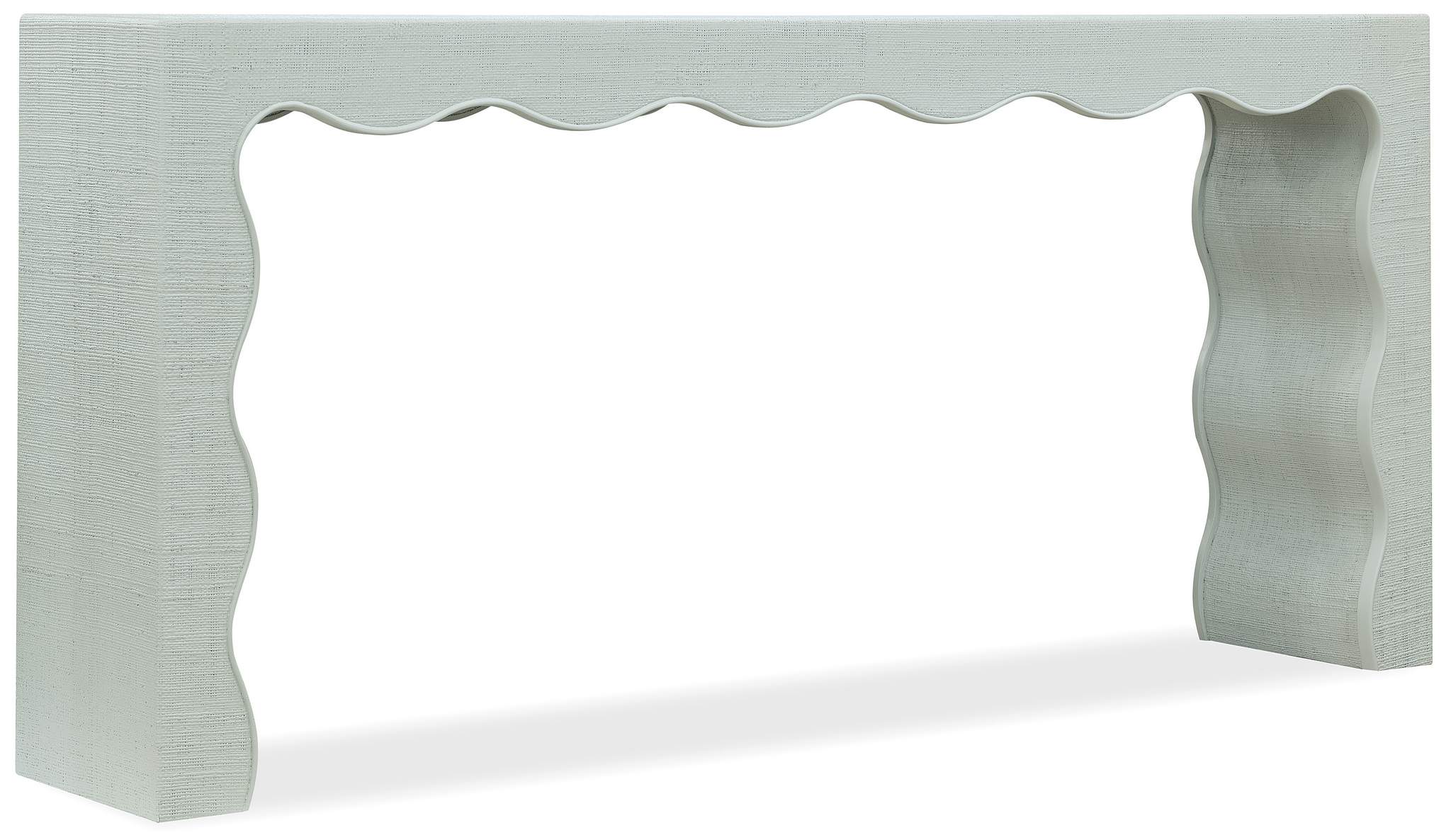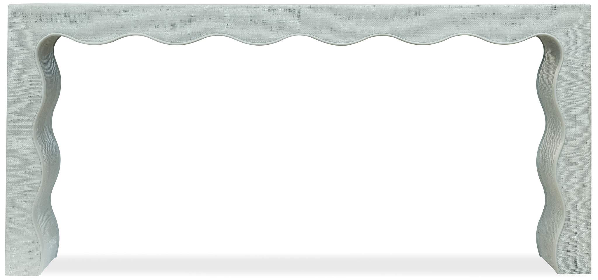 Wrapped in a blue-green painted raffia, this narrow console table makes a bold, coastal-inspired style statement with its scalloped design.