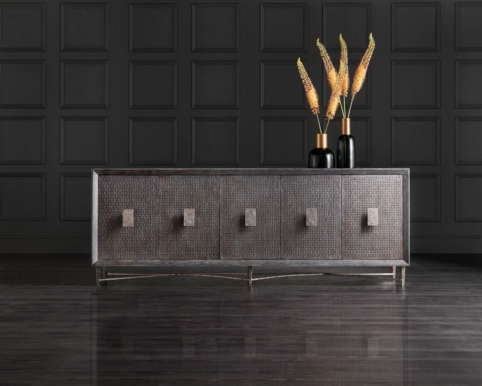 An unexpected eclectic blending of texture, form and function with an understated and timeless beauty, the Mélange Keenan Five-Door Credenza combines a weave-like tactile surface with a shaped silver metal base and distressed metal hardware in an oversized rectangle shape. There’s one drawer behind the pair of left doors, creating one shelf, and one drawer behind the pair of right doors, creating one shelf, and two adjustable shelves behind the center door. Crafted of Oak Veneers, resin and metal, there’s a ventilated back panel and wire management holes in the back panel.