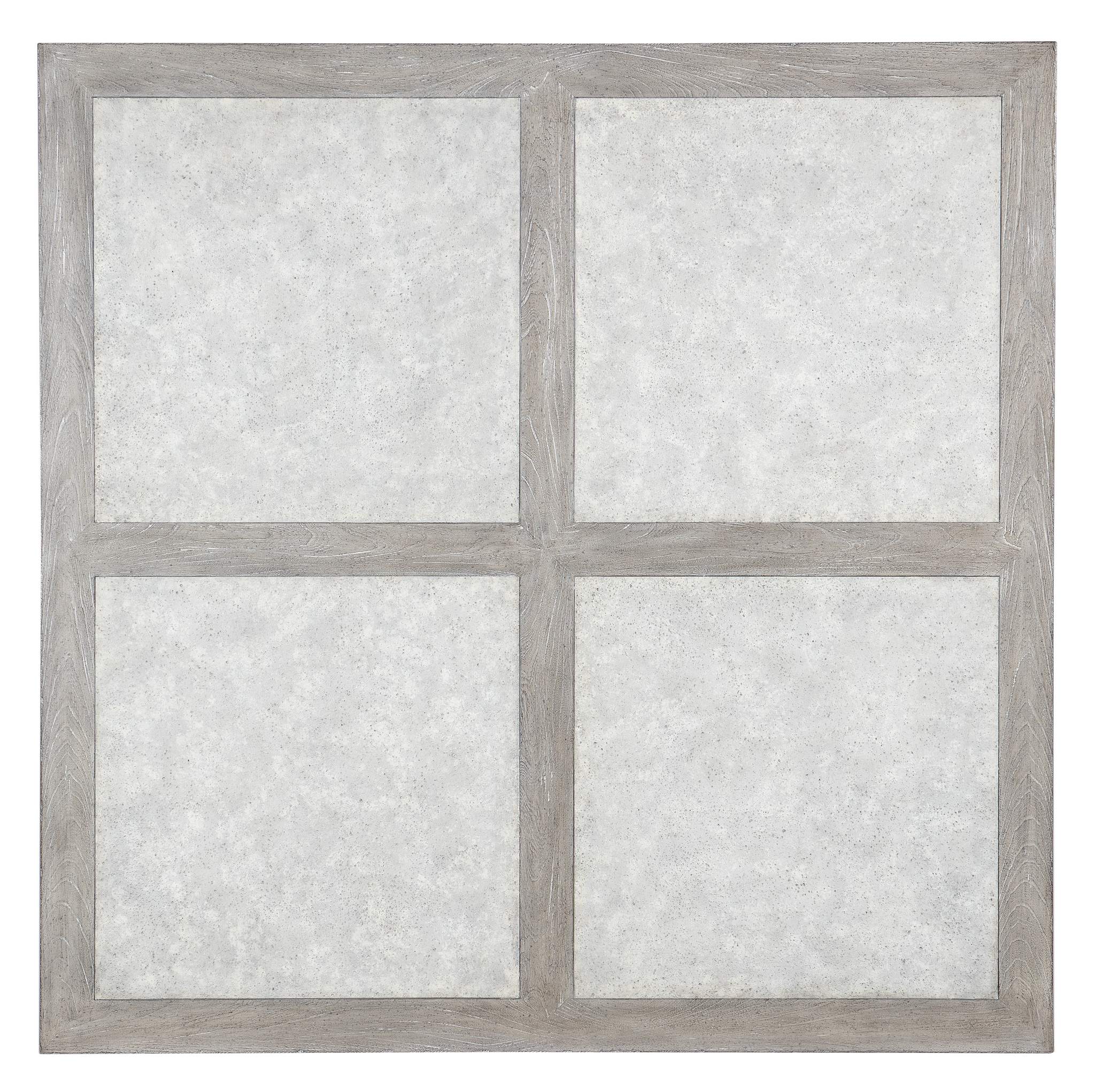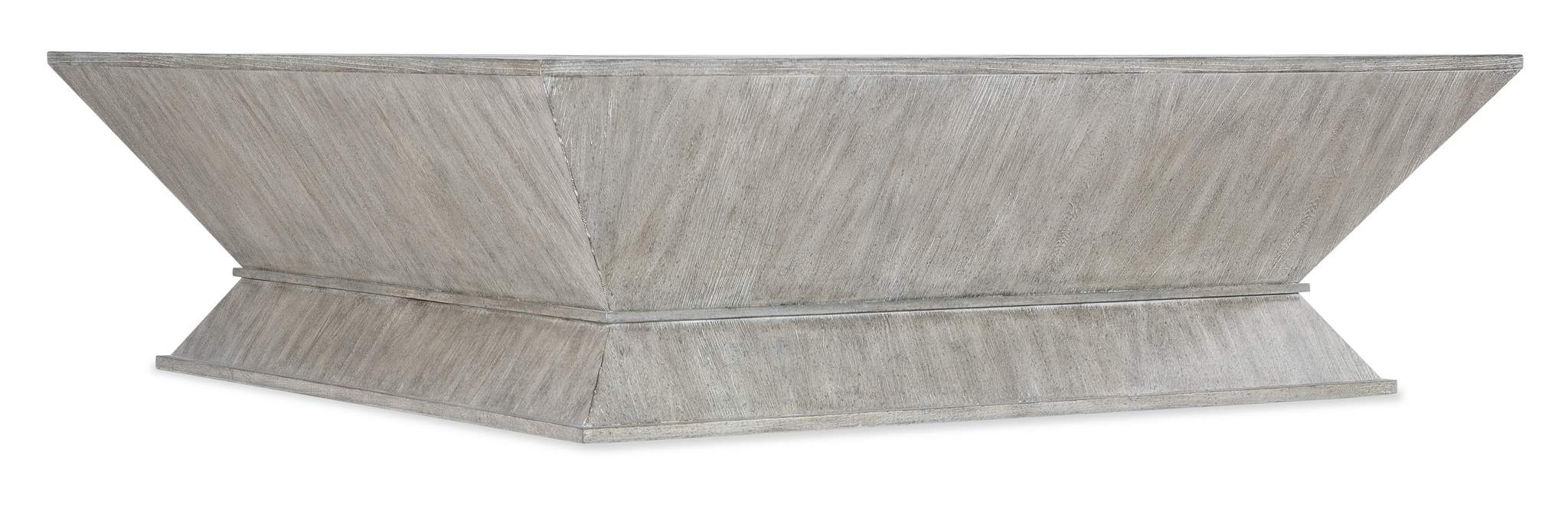 With a chic chunky shape and four paned stone-like panels on the top, the Korena Cocktail Table has a casual organic look with a serene gray finish over Elm Veneers and resin.
