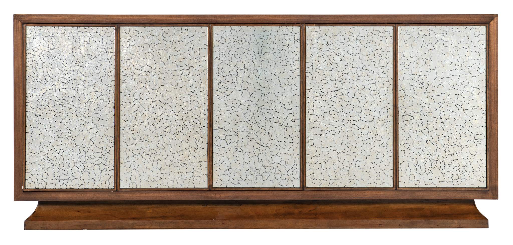 A case crafted of Walnut Veneers with glass and silver leaf doors creates a modern yet timeless and elegant piece with the Lloyd’s Leopard Entertainment Credenza. The Walnut Veneers are in a rich wood finish, with five painted silver leaf glass-front doors, soft-close hinges and magnetic touch latches. There’s one drawer behind the center door, and one adjustable shelf behind the left and right pairs of doors. The drawer creates one fixed shelf behind the center door. Accommodates up to an 80-inch TV.
