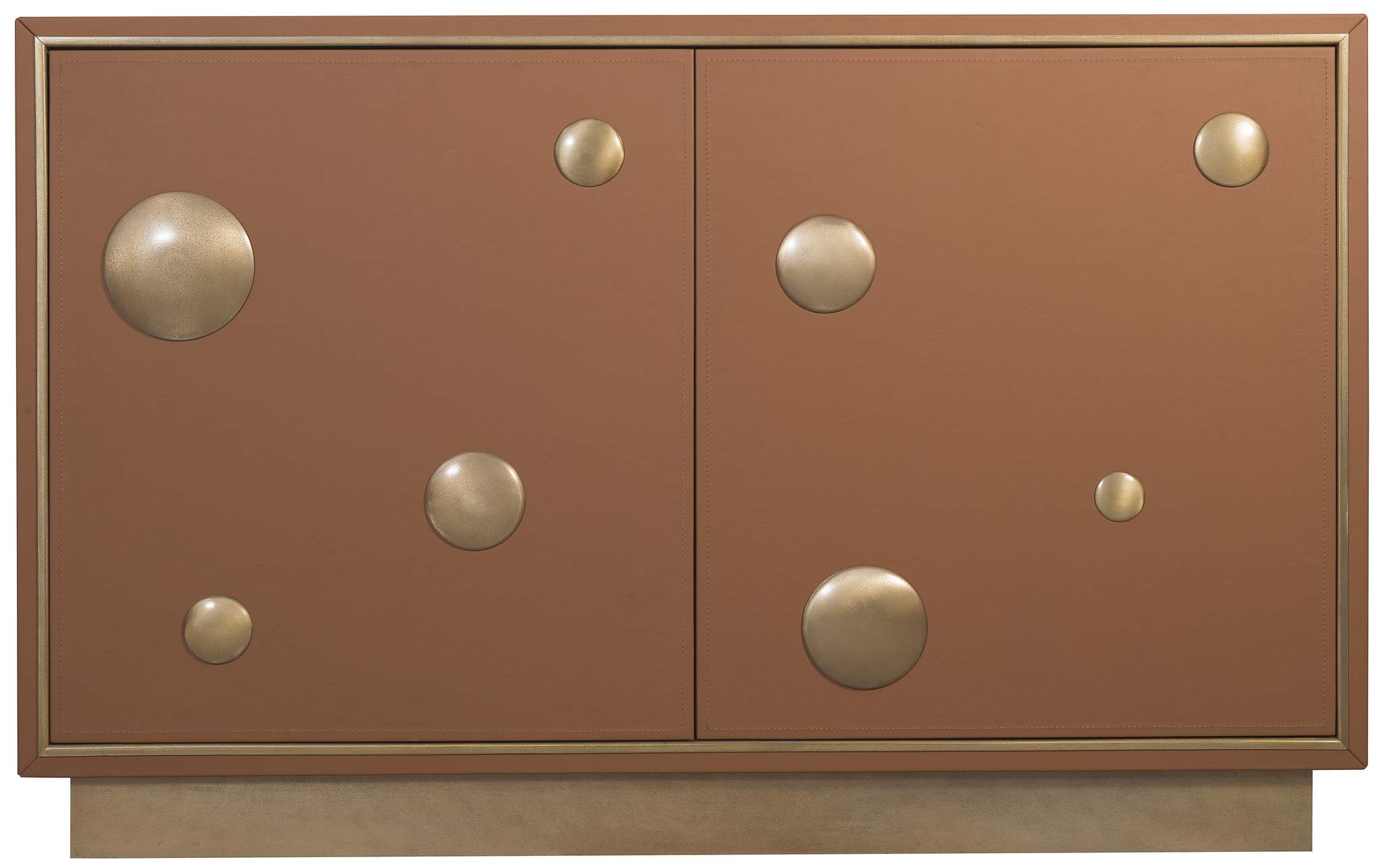 Wrapped in rich brown leather with gleaming gold circle accents, the Lottie Dottie Chest is both chic and functional. Soft-close doors reveal drawers and adjustable shelves—crafted to add couture-level style to any room.