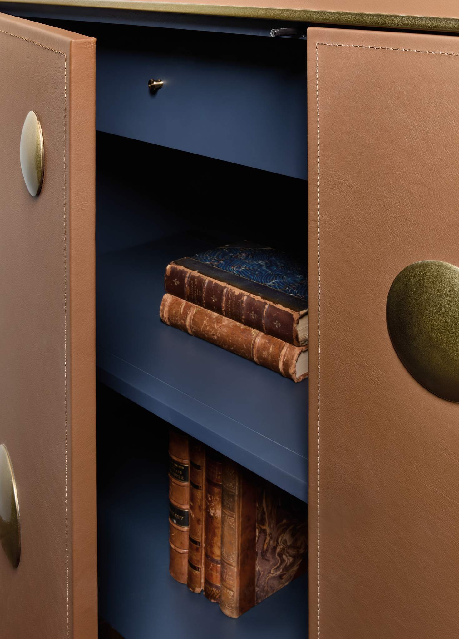 Two leather wrapped push touch doors with soft-close hinges