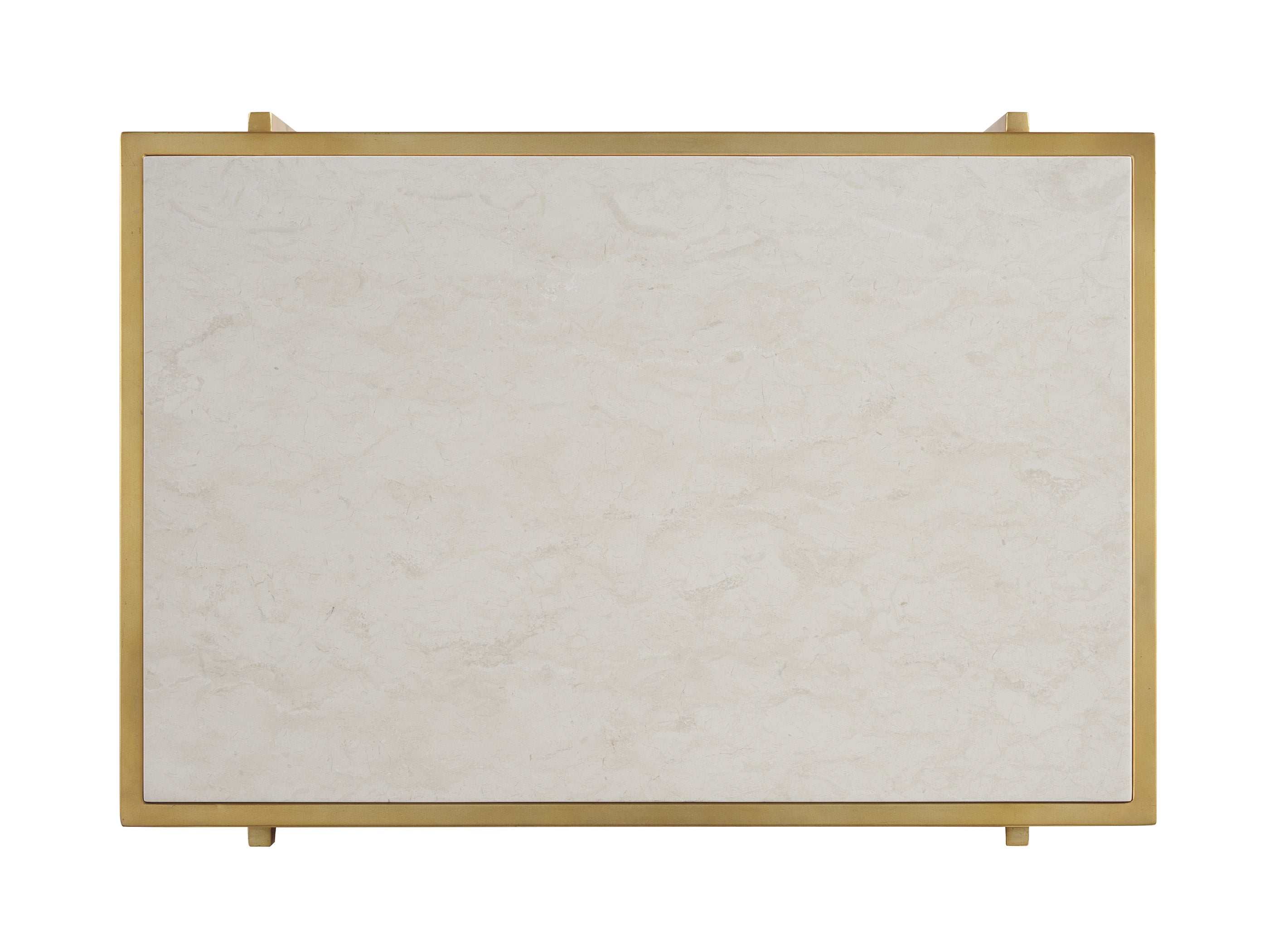 The Pinnacle end table features an architectural metal base finished in satin gold, an Anticato marble top and an inset tempered glass shelf.