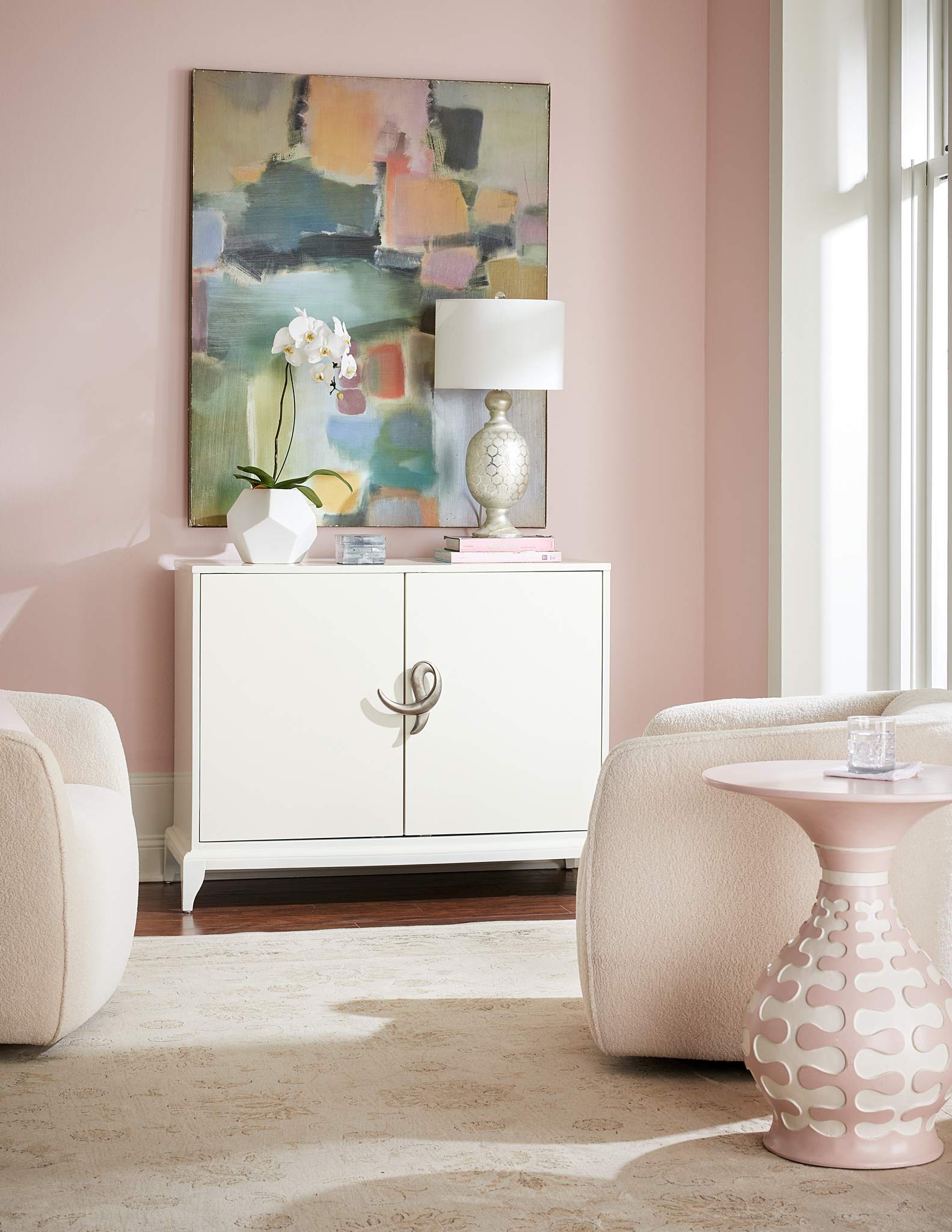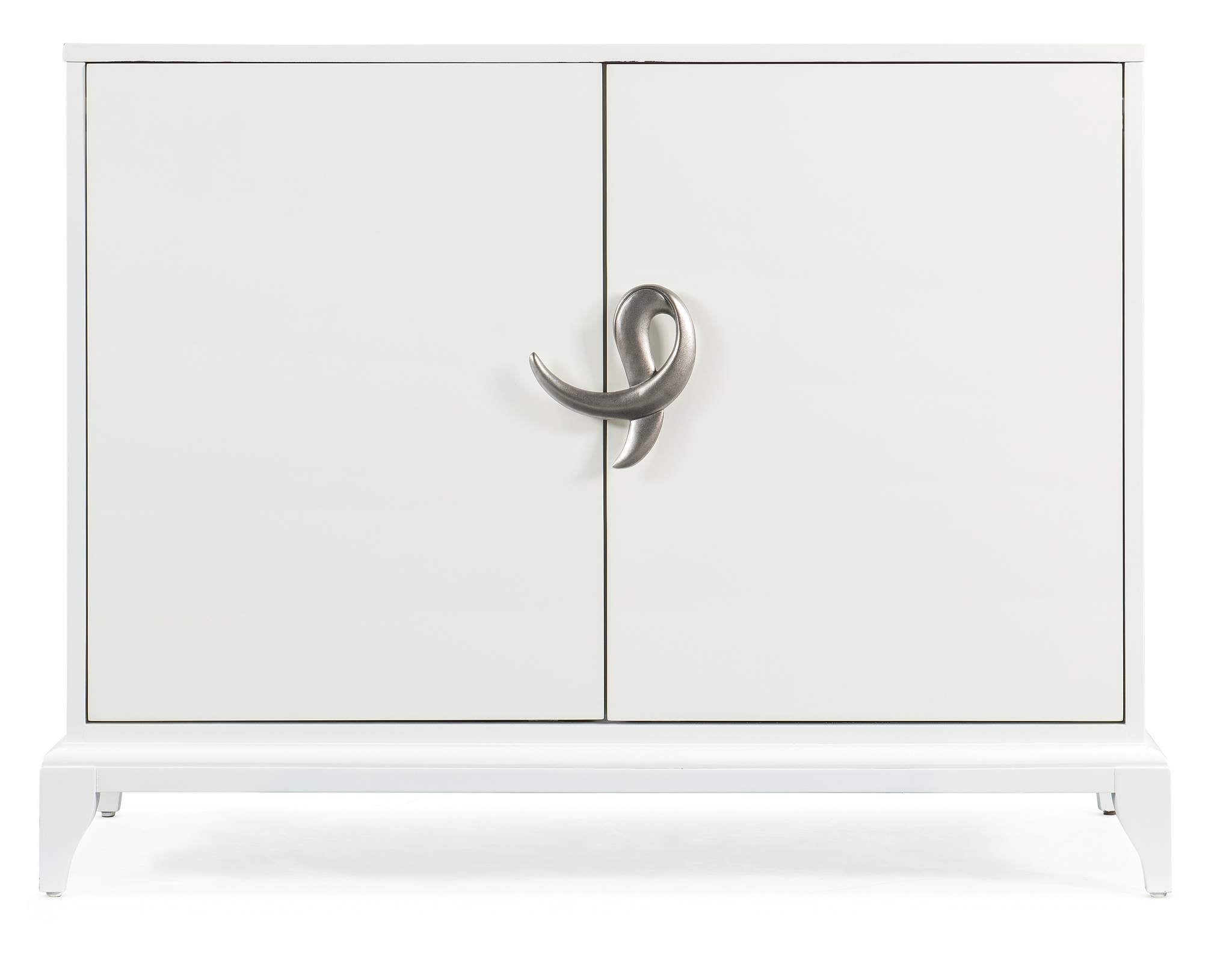 Sleek and modern meets soft and soothing with the Unity Chest. Part of a curated collection to honor the spirit and courage of those diagnosed with breast cancer, the chest contrasts a creamy white exterior with a magenta-colored interior, accented by antique pewter ribbon-designed hardware. The two doors have soft-close hinges and one adjustable shelf behind each. Crafted of Maple Veneers, a portion of the proceeds from each chest sold goes to the Susan G. Komen Foundation.