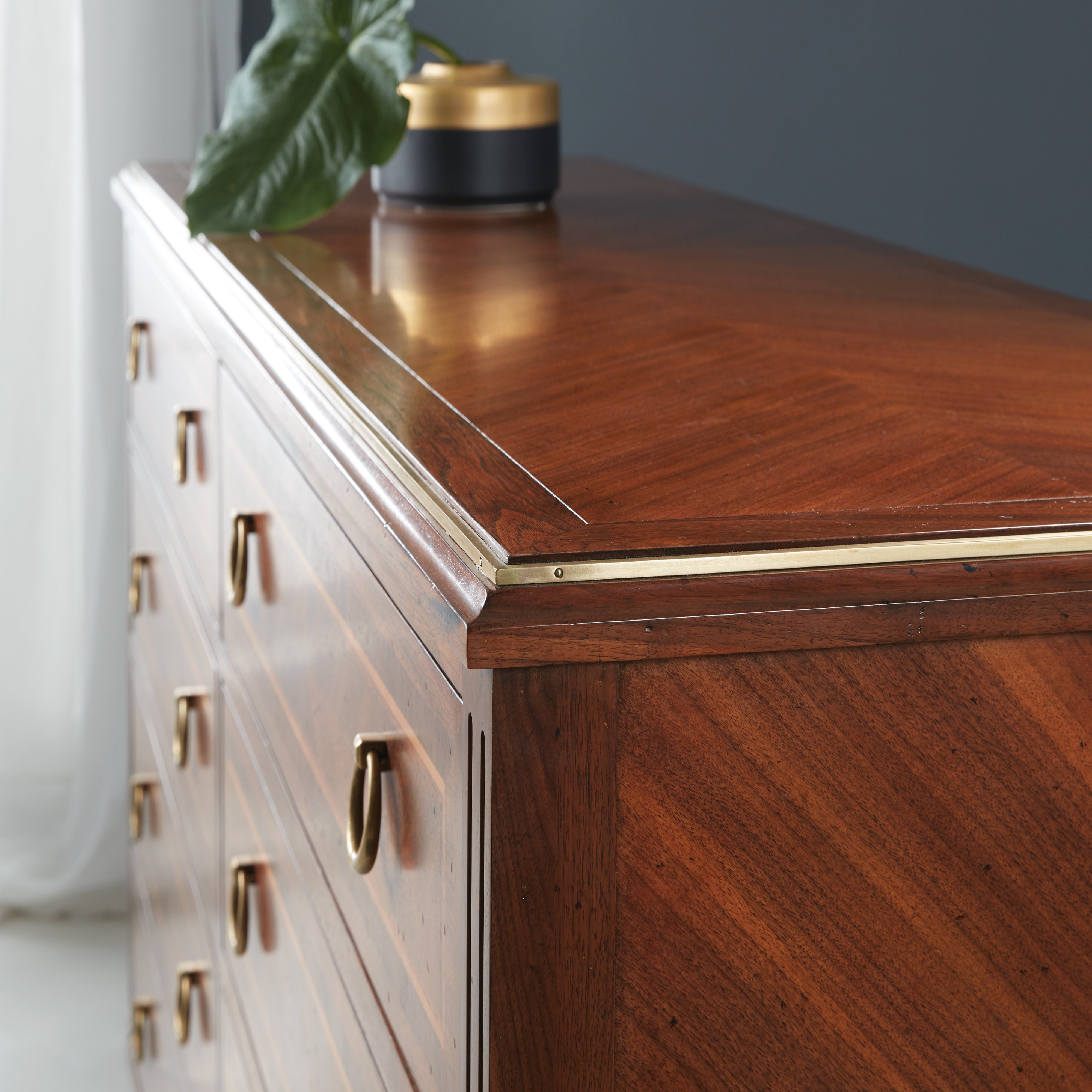 Materials: Walnut Veneer; Brass Hardware & Accents