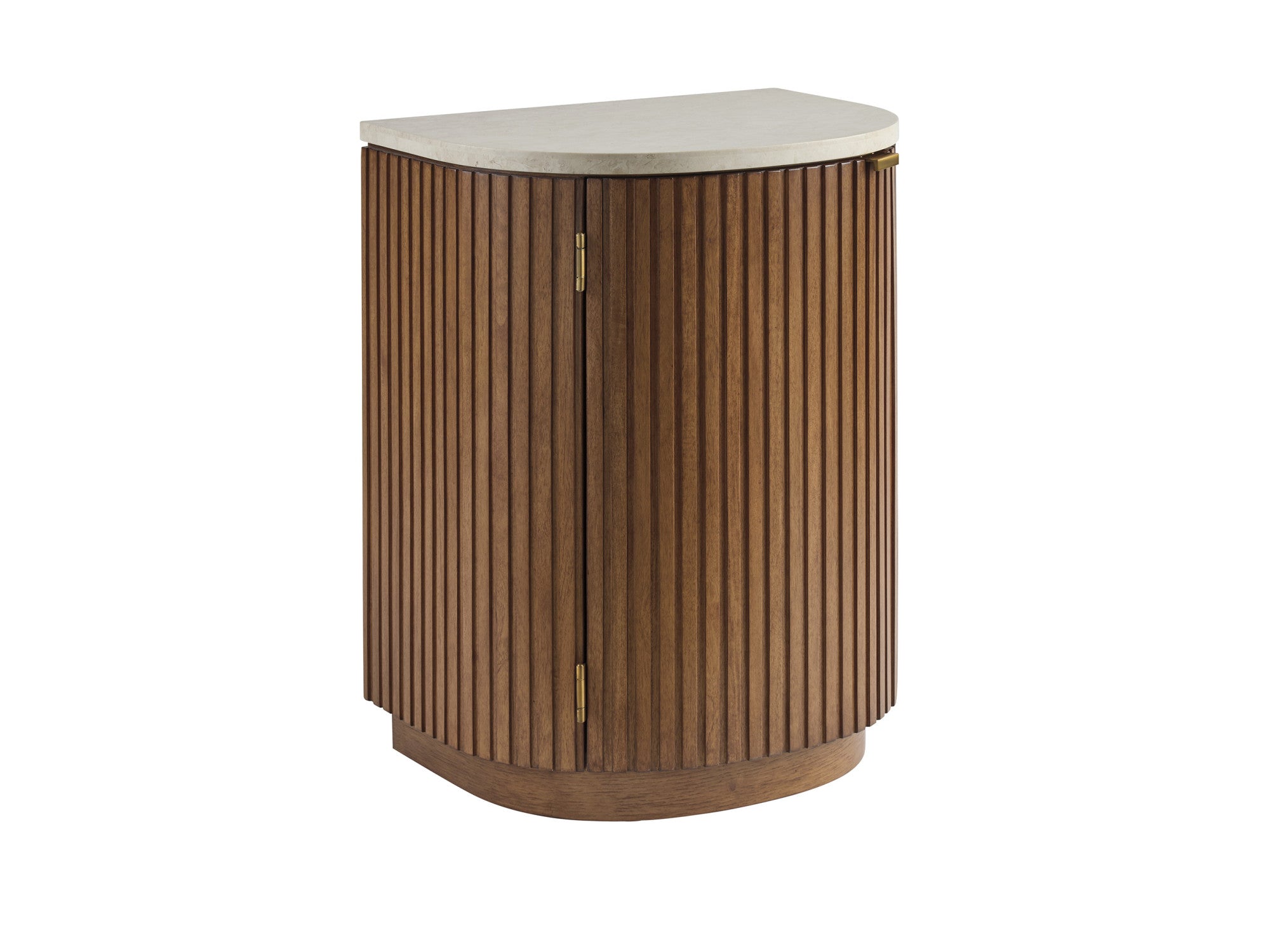 The Aviara demilune nightstand offers a perfect option for smaller bedrooms. The design features fluted detailing, a veneered Anticato marble top, a concave stationary shelf behind the door, and a recessed plinth base.