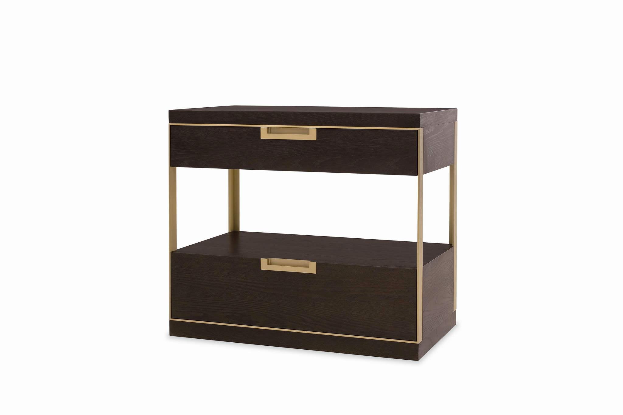 Crafted from Oak Solids and Narrow Heart Oak Veneer the Cadence Two Drawer Nightstand features Antique Brass trim wrapping around the two separate soft close drawers, and serving as the supports for the suspended top. Antique Brass drawer pulls are recessed into each drawer.