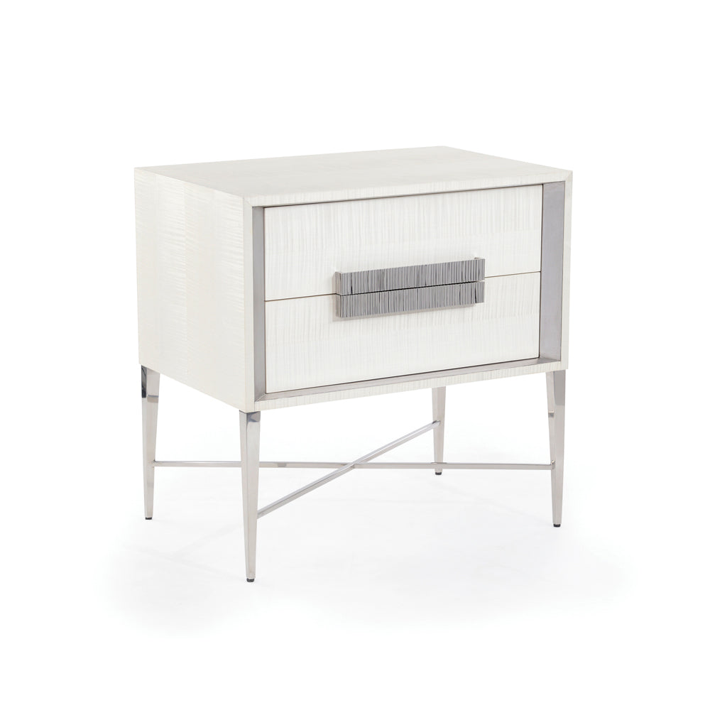 This contemporary nightstand features two drawers and a brushed stainless steel base. The case has a dyed fiddleback sycamore veneer in arctic white with chamfered insets in pewter silver. Each drawer features a cast stainless steel handle with a textured design.