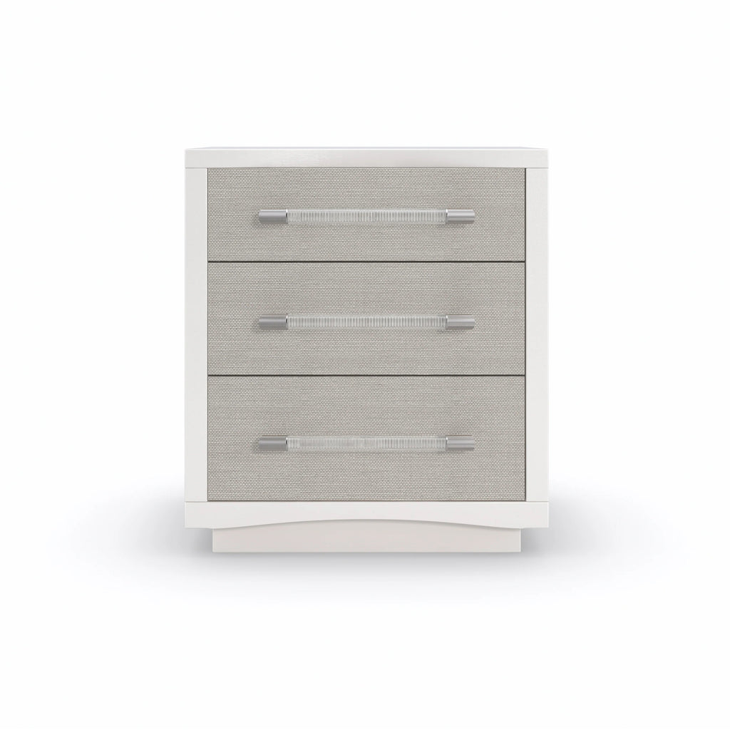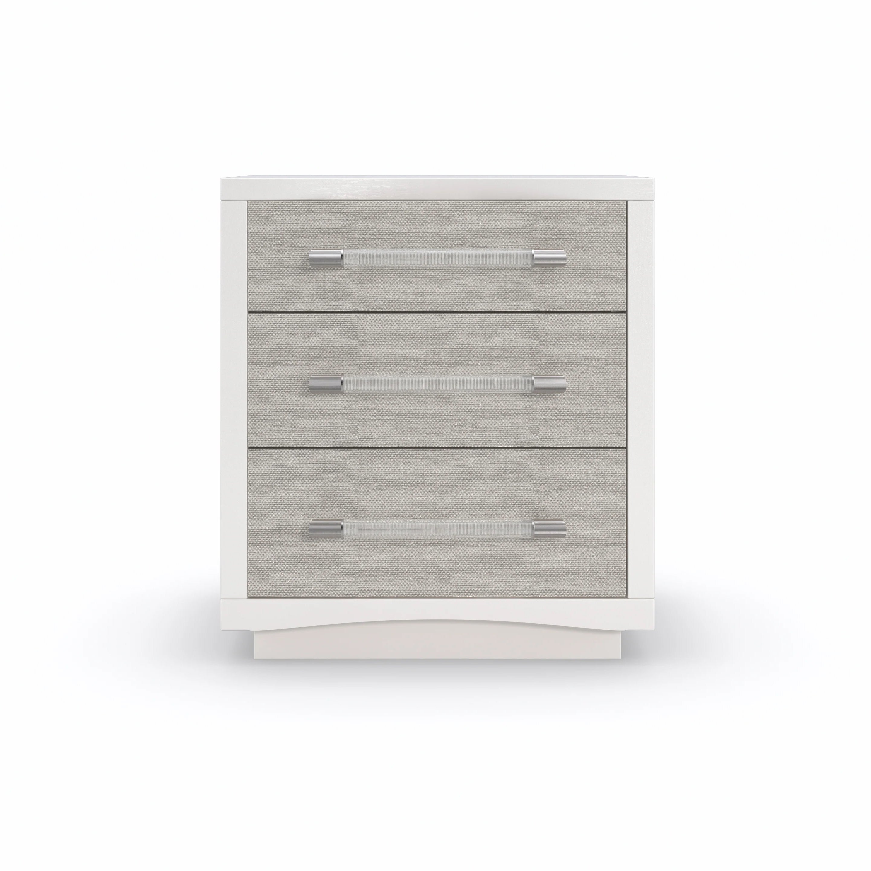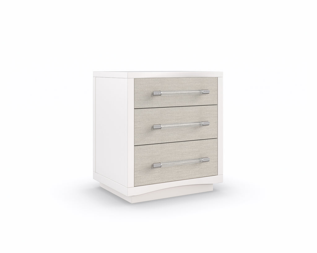 This elegant bedside table introduces a softly textured, metallic element with inherent organic character. Woven raffia drawer fronts are reimagined in Sun-kissed Silver, complemented by ash veneers in a Pearly White finish. For a distinctive finishing touch: clear acrylic drawer handles are capped in ribbed stainless steel. Features a USB port on the back for convenient charging and cutouts for wire management.