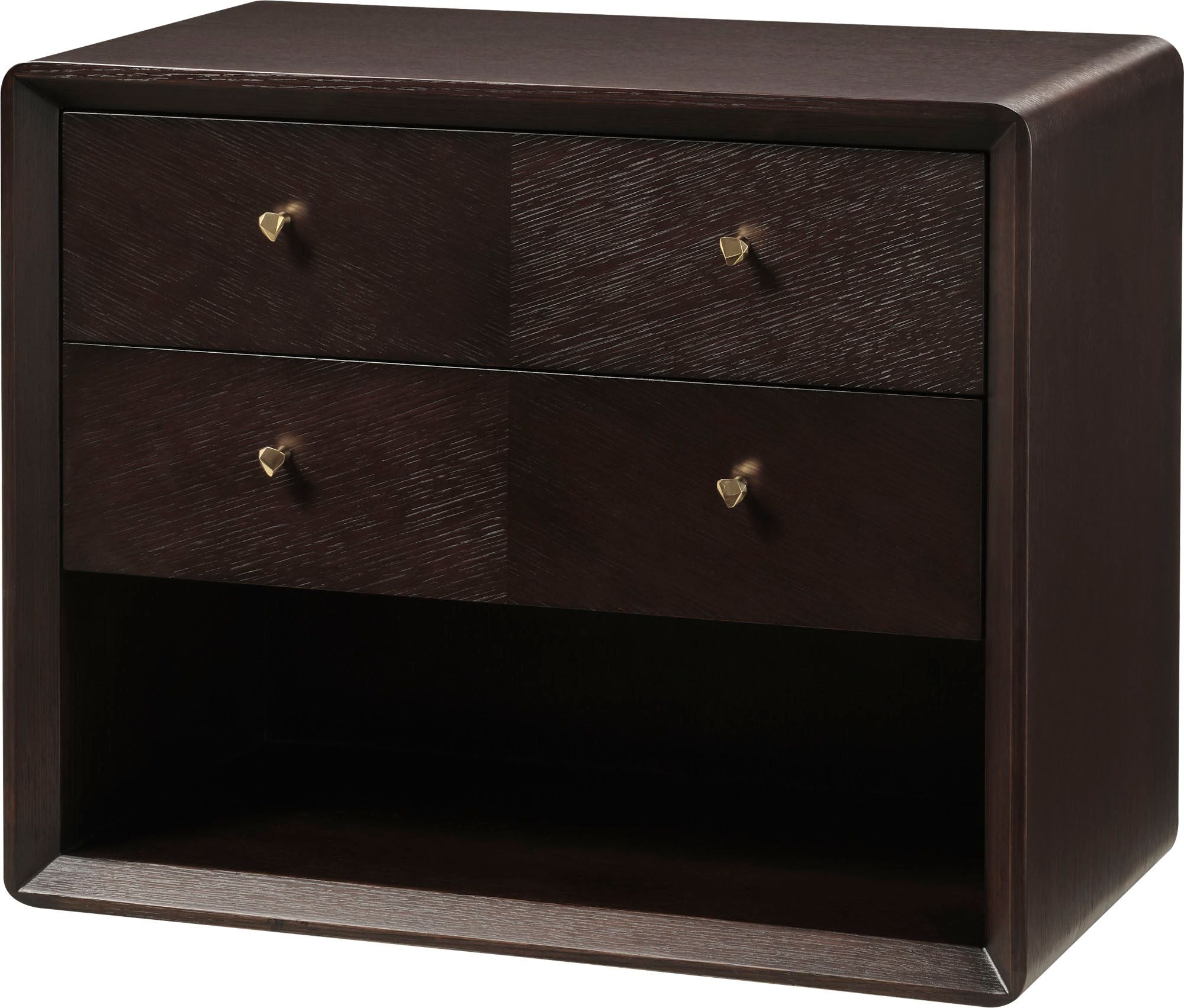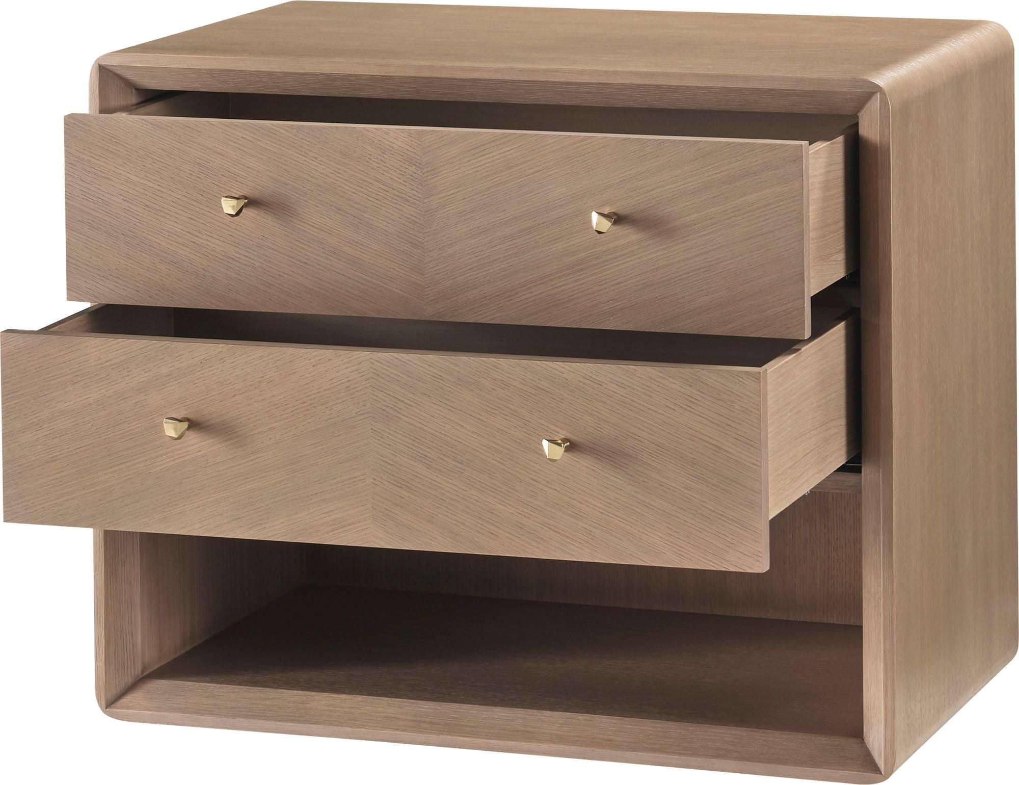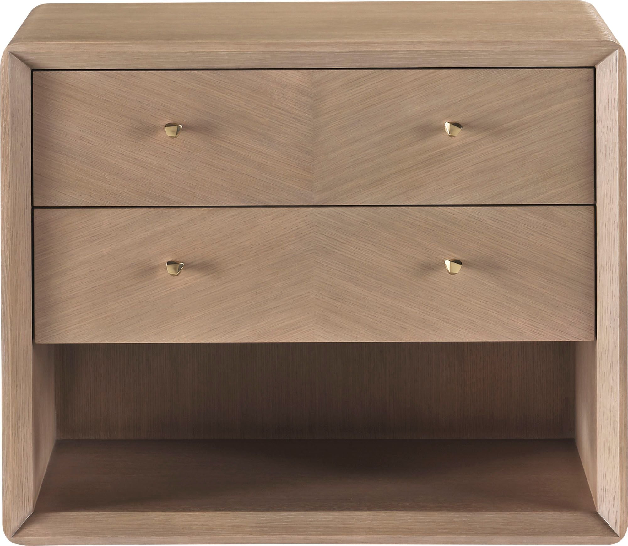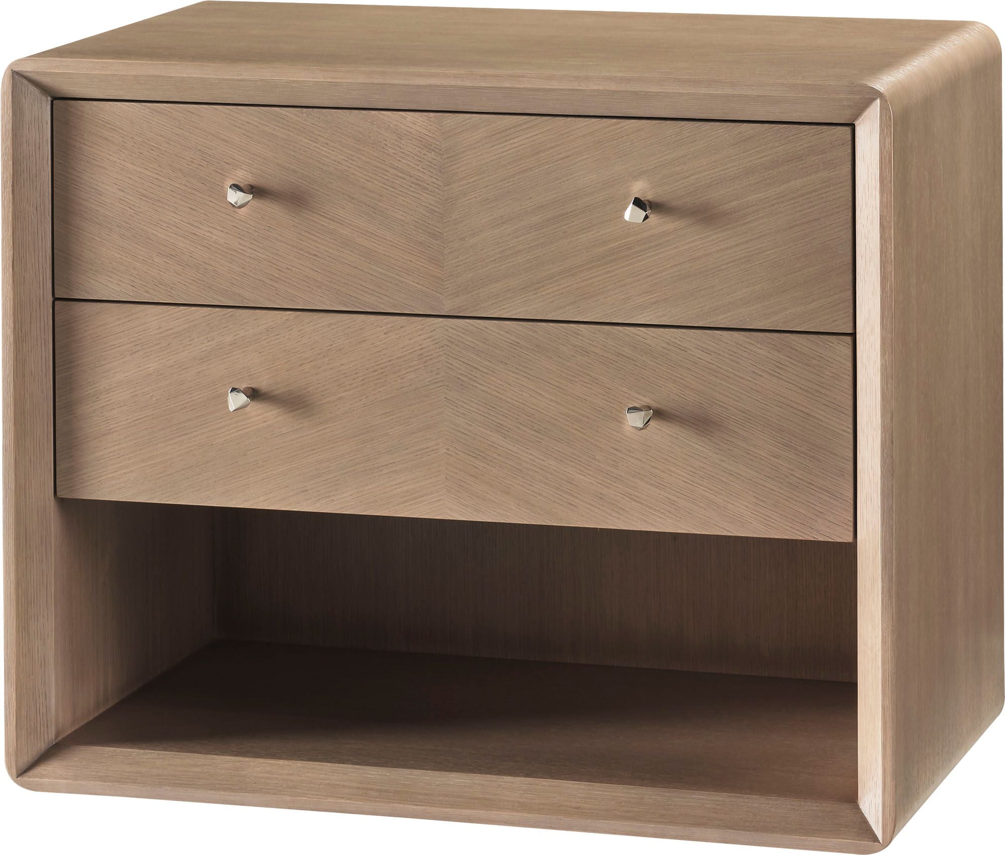 Modern and minimal, the Harper Bedside Table merges quartered oak veneer and faceted, sculptural handles made from Nickel Plated Brass or Pure Brass. The table offers two drawers for convenient bedside storage.