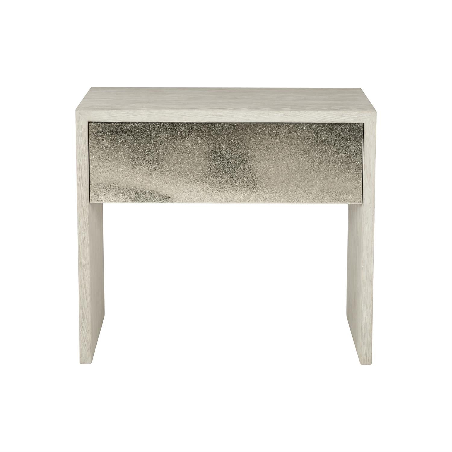 Bernhardt Interiors offers high-design furniture with an eclectic edge. Sleek and modern, the Lowe nightstand features a minimalist wooden frame and a single push-to-open drawer. White oak veneers in a jicama finish pair elegantly with cast aluminum in a shiny nickel finish.