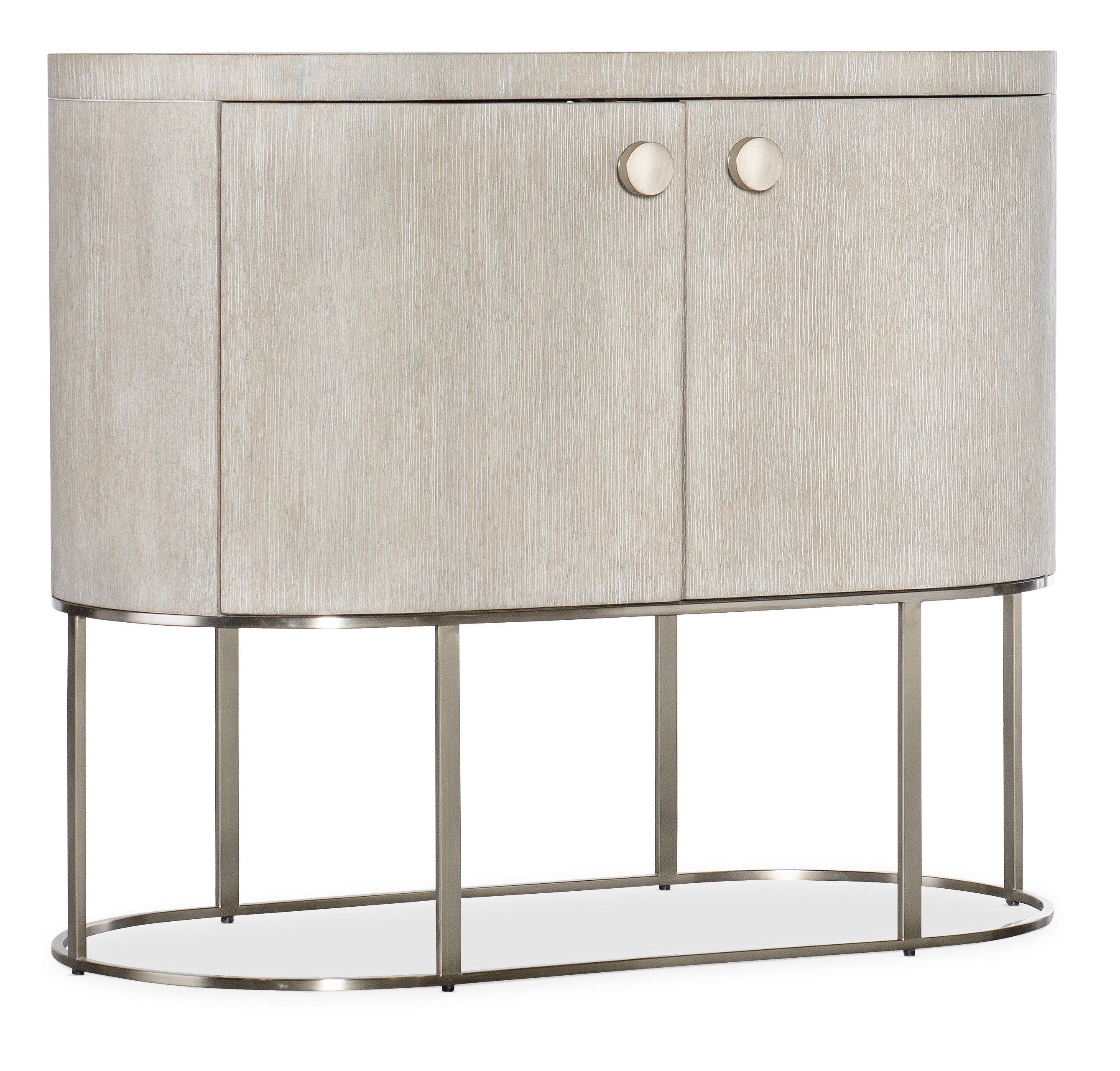 Architectural and timeless with a luxe mixture of materials, the Modern Mood Oval Nightstand is a statement piece. The shaped metal base gives the nightstand a floating appearance. Crafted with Quartered Oak Veneers, the piece is finished in a serene, crystal-like Diamond color. The two doors have soft-close hinges and magnetic door catches, and there ’s one adjustable shelf behind. Finished on all sides and features wire management on the back.