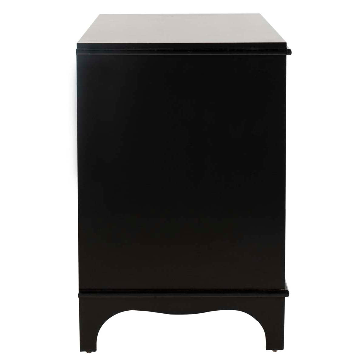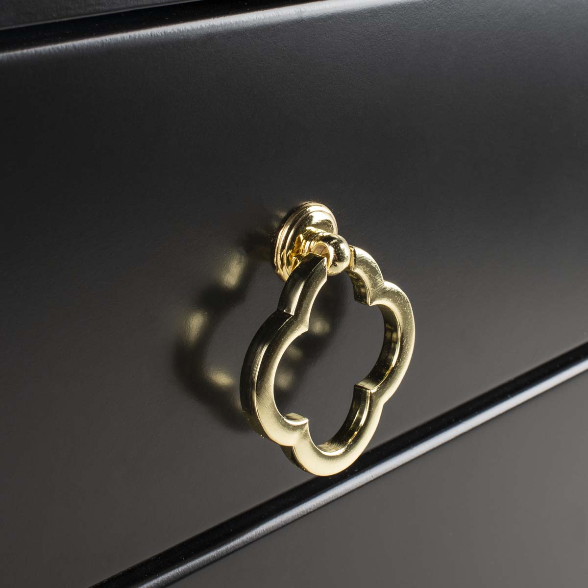 A modern heirloom with ample storage, this contemporary nightstand is a designer favorite. Finished in black, its sleek lines, gentle curves and exquisite brass quatrefoil pulls make it a grand focal point in any bedroom.