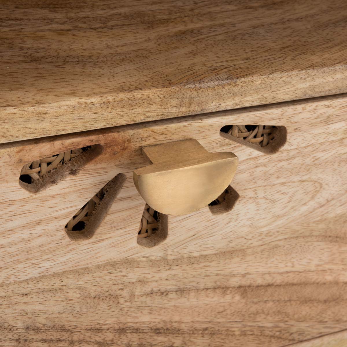 Inspired by Scandinavian style, the bold sculpted floral design on this 1 shelf 1 drawer nightstand adds modern romance to the bedroom. Crafted with a natural cane finish on mango wood and brass finished iron legs, it?? a designer must have.
