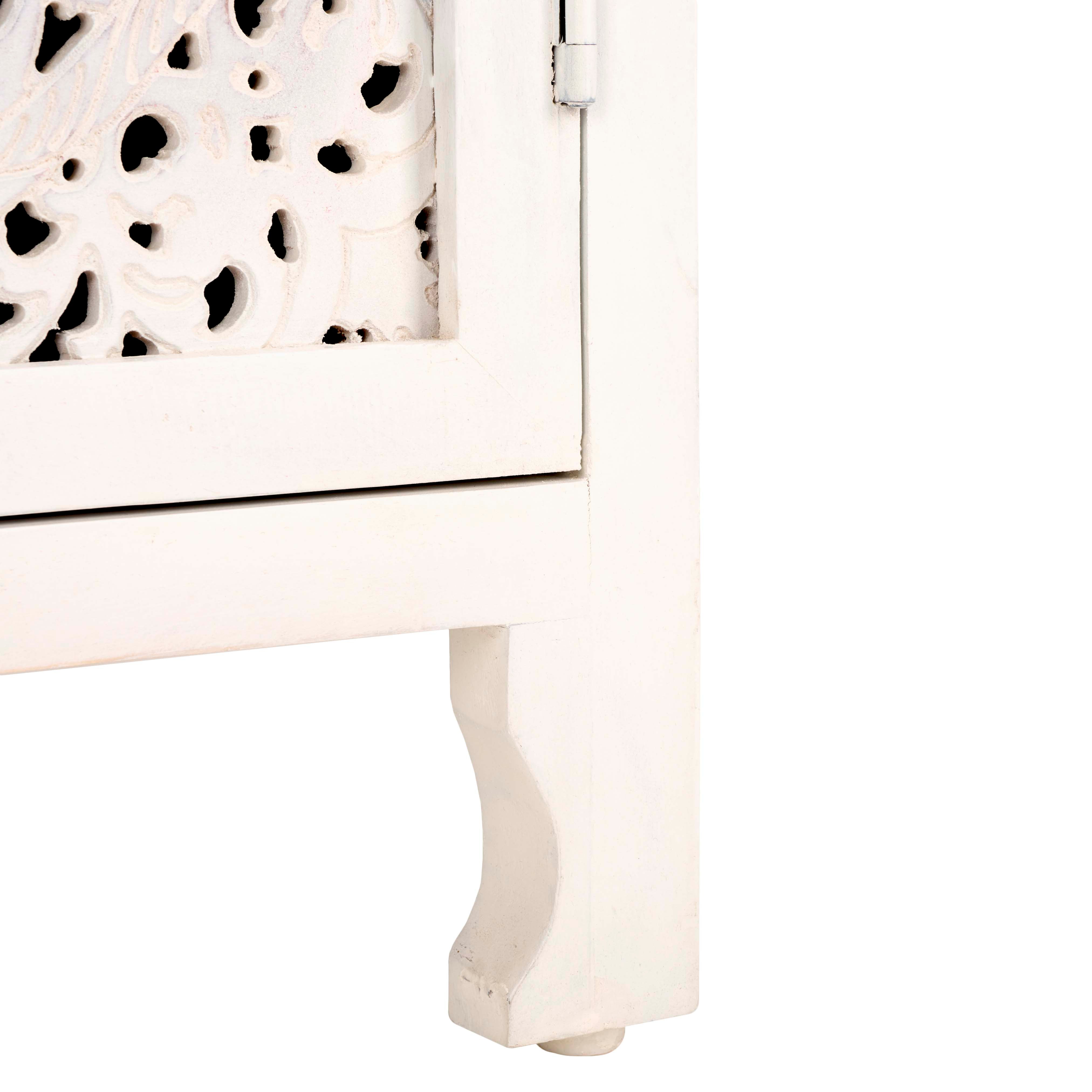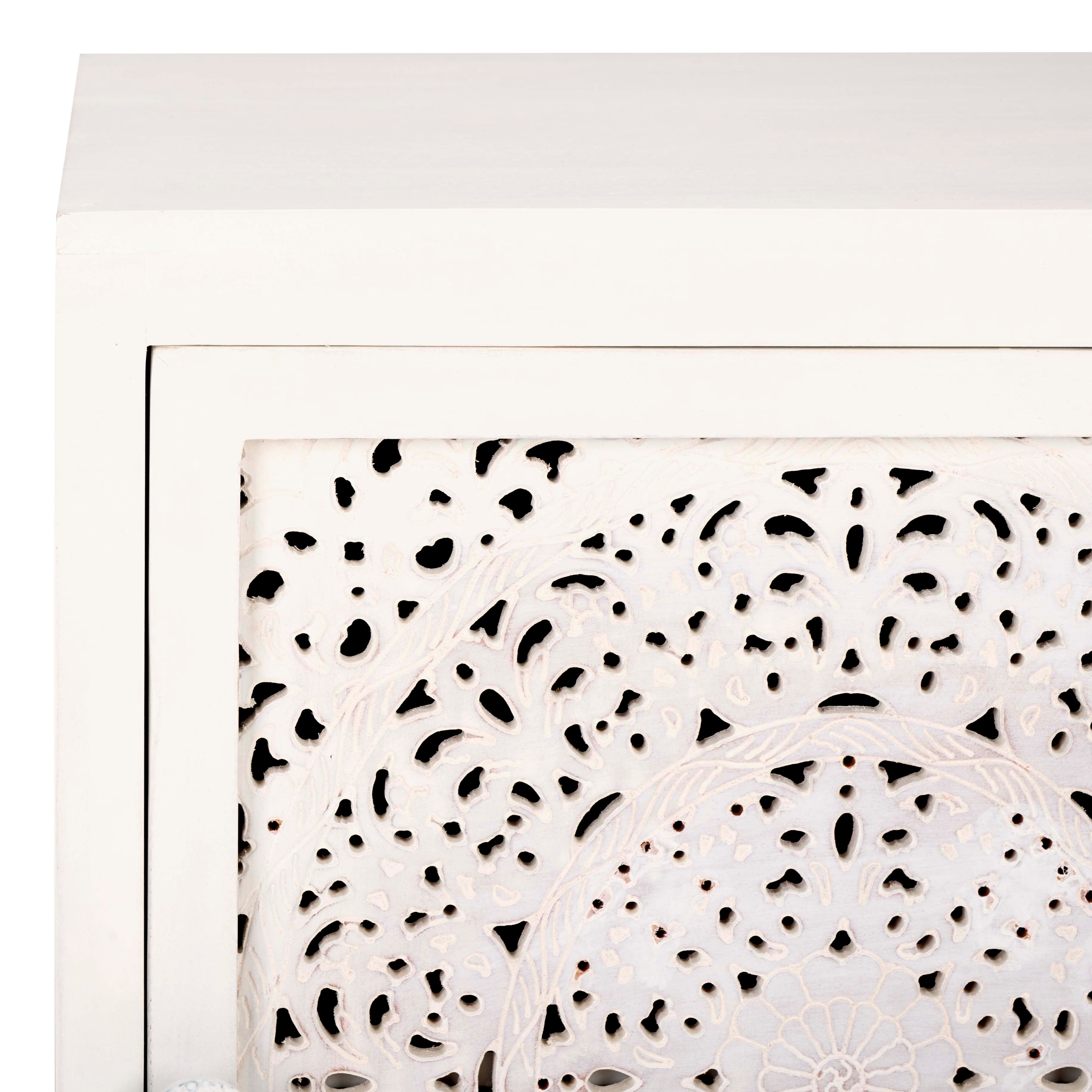 Add an artistic flair to your bedside with the Raura nightstand. Carved from Mango wood, our side table remains beautifully detailed. It combines vegetal patterns within a bold and eye-catching geometry. The striking piece is completed with subtly curved legs and a white wash finish to attain a graceful vintage look. Behind the artisanal facade hides two roomy shelves to keep all your nighttime essentials within easy reach.