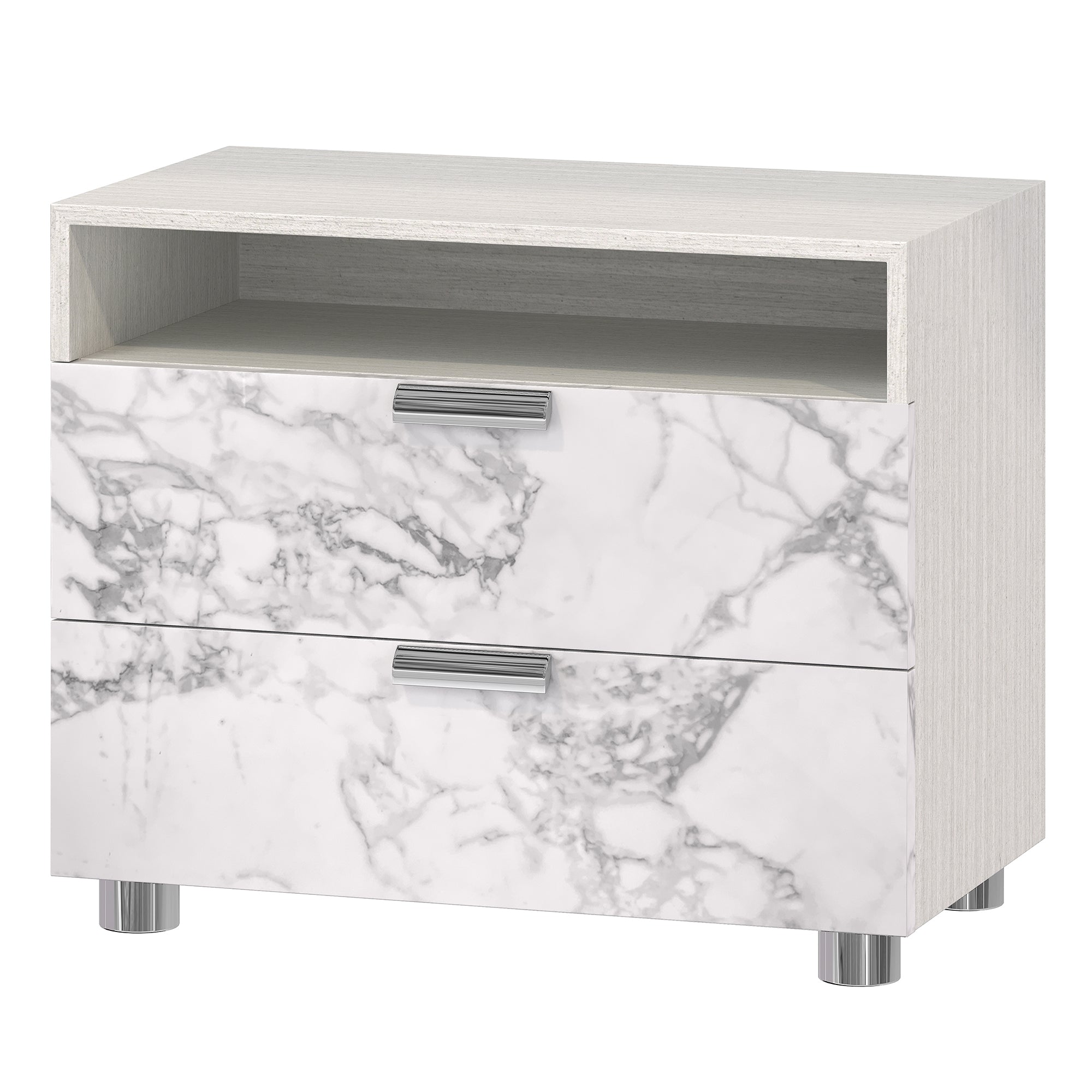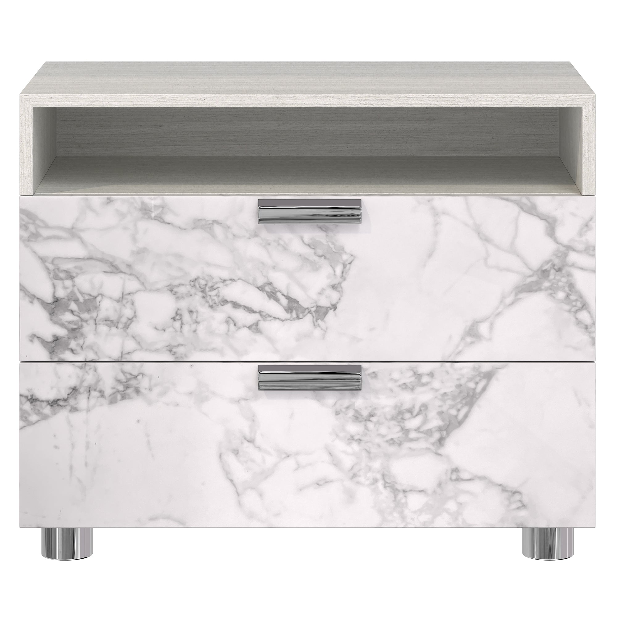 Mist Finished Case With One Fixed Shelf, Two Drawers With Stone Fronts, And Polished Nickel Feet With Adjustable Glides. Two-Port Usb Charger On The Back.