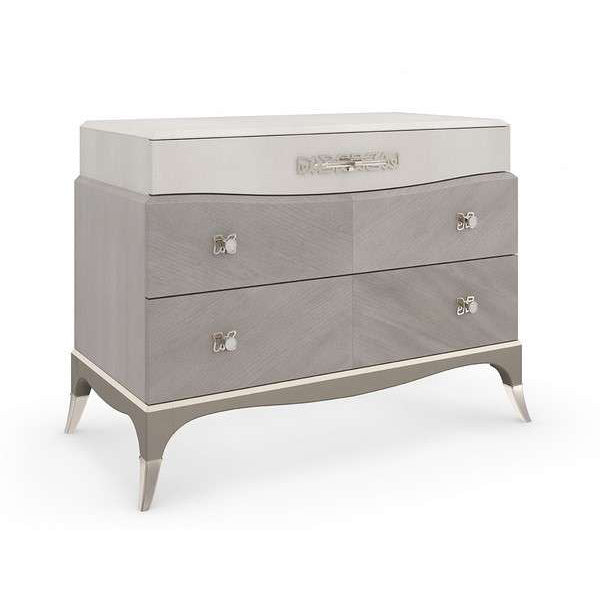 With a top box wrapped in Alabaster-painted faux shagreen, the Vibrato dresser celebrates the art of adornment in contemporary form. A creamy Cappuccino finish highlights the linear grains of Coffee Platano veneers, accentuated by decorative backplates in a Whisper of Gold and custom hardware with a ceramic inset. Features two spacious drawers beneath the top box, elevated on outward curving legs capped in metal ferrules.
