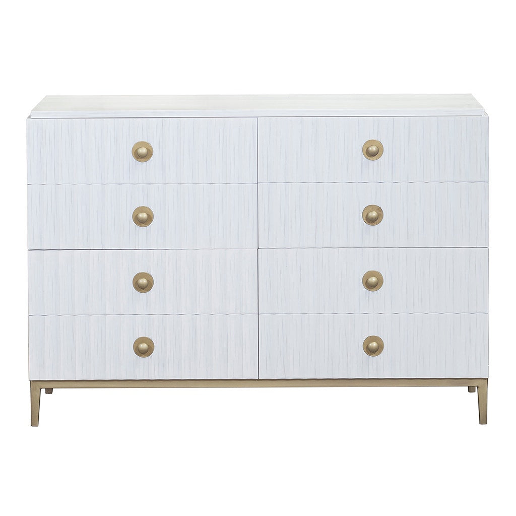 The epitome of casual elegance, East Camden is an elevated mix of casual textures and luxe accents. Dimensional wood-carved detailing and a textured Pearl finish is balanced against luxe, Carrara marble surfaces and Antique Brass metal accents.