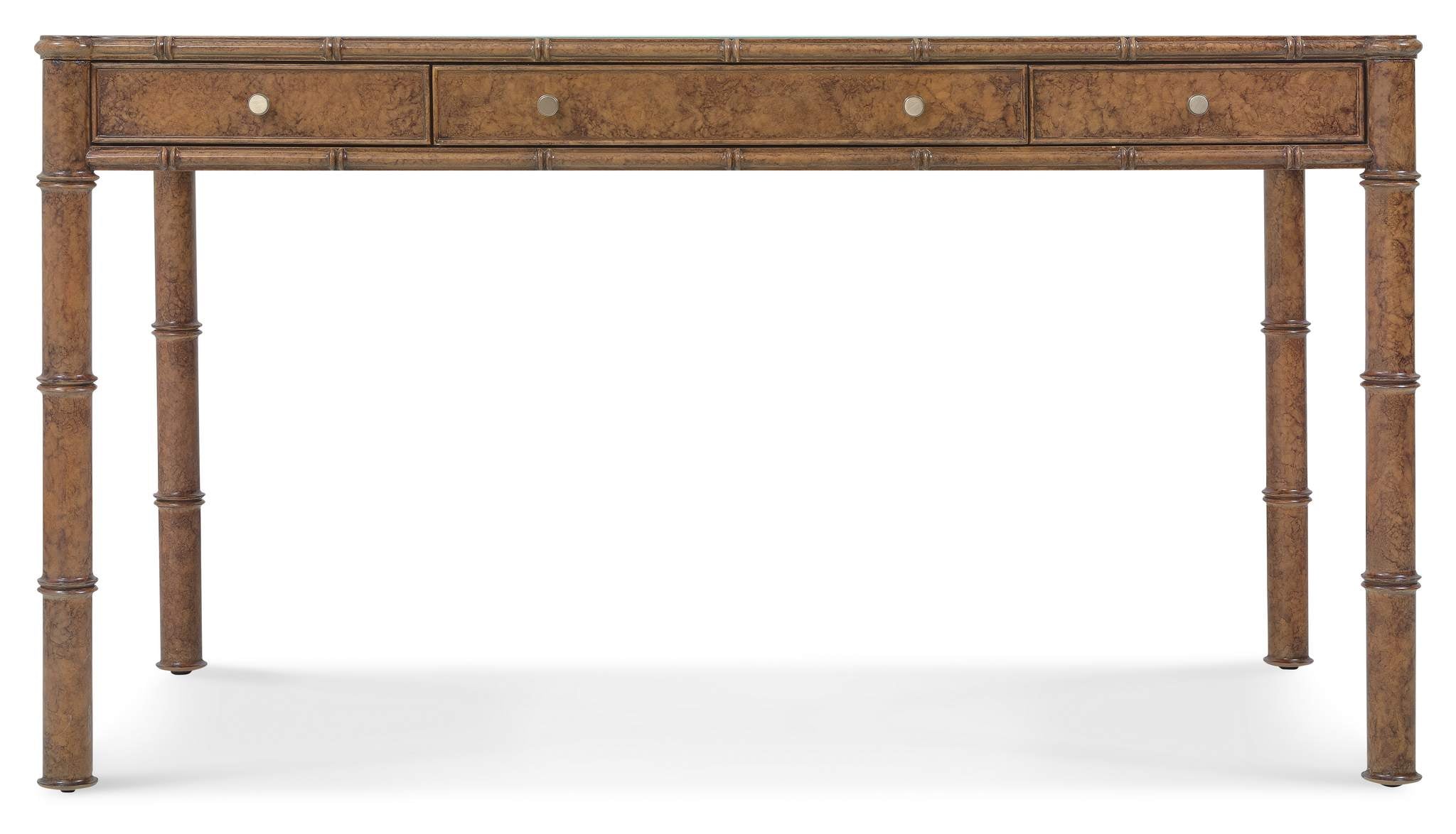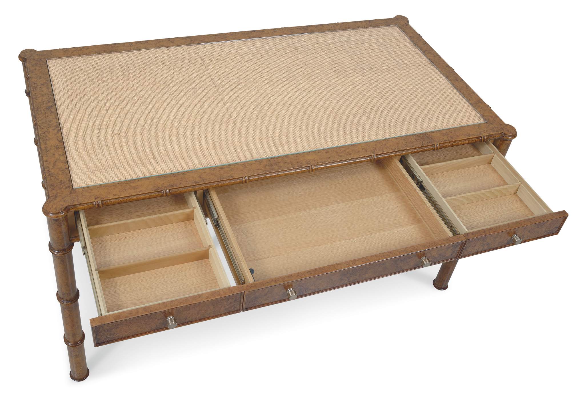 The Archives Writing Desk combines historical charm with modern functionality, ideal for creating a sophisticated home office. Its design features rich birch and oak veneers, a unique mottled amber faux-tortoise shell accent finish, and woven cane top with a protective glass insert. Perfect for both writing and work, this desk offers three drawers, a drop-front center drawer for a keyboard, and removable dividers for organization. The satin brass custom knob hardware adds a luxurious touch, making it the perfect blend of style and practicality.
