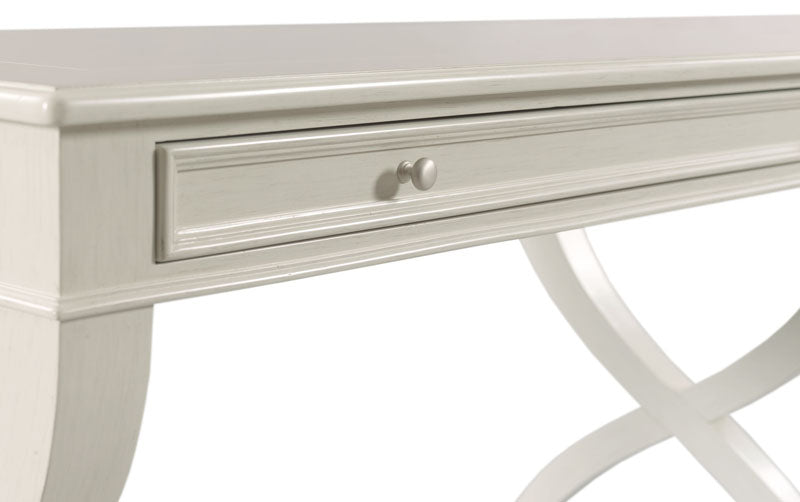 A rectangular top rests over an apron rail drawer flanked by curvaceous intersecting legs.