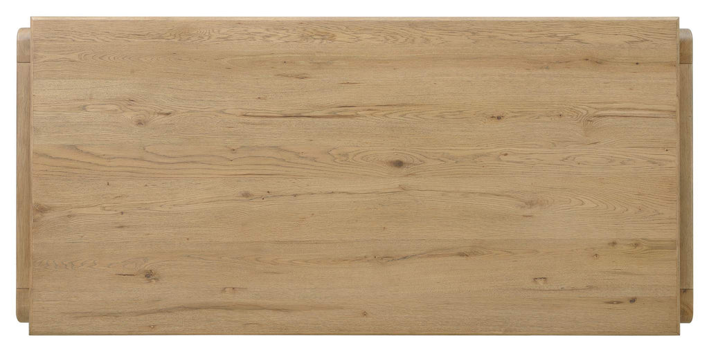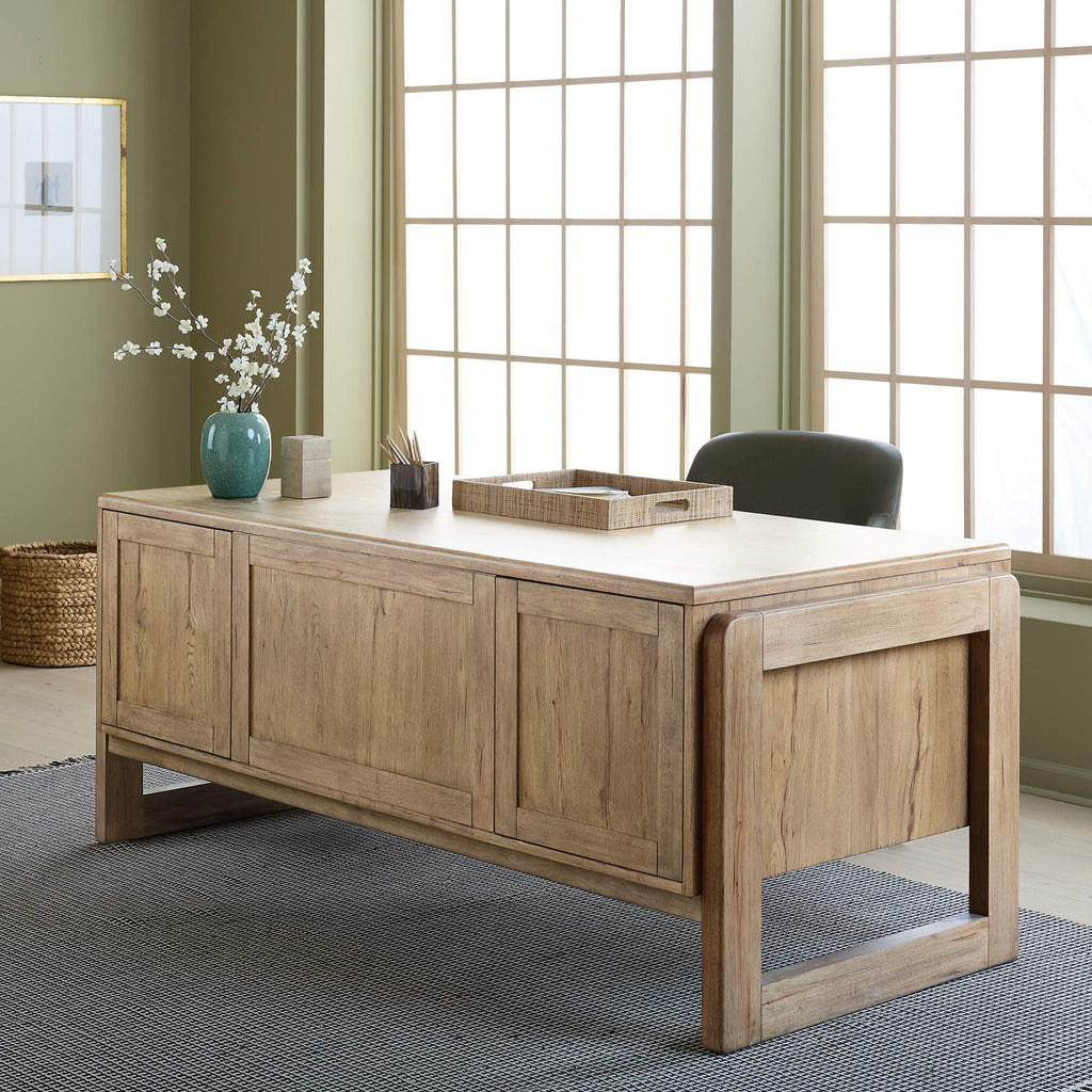 The four-piece Kalamazoo Home Office Collection evokes the look of furniture salvaged from workshops or industrial settings, featuring oak veneers in an aged finish that adds to the authenticity of each piece.