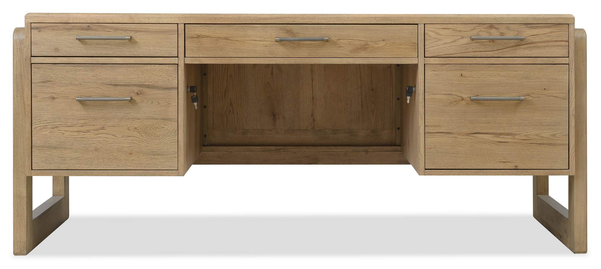 Make a bold statement in your home office with the Kalamazoo Executive Desk. This industrial-inspired desk features an aged oak veneer finish, providing a vintage aesthetic with modern functionality. It includes two file drawers, utility drawers with dividers, and hidden storage areas with touch latches for added efficiency. Perfect for executives or home professionals, the desk combines spacious storage and a striking design that enhances productivity.