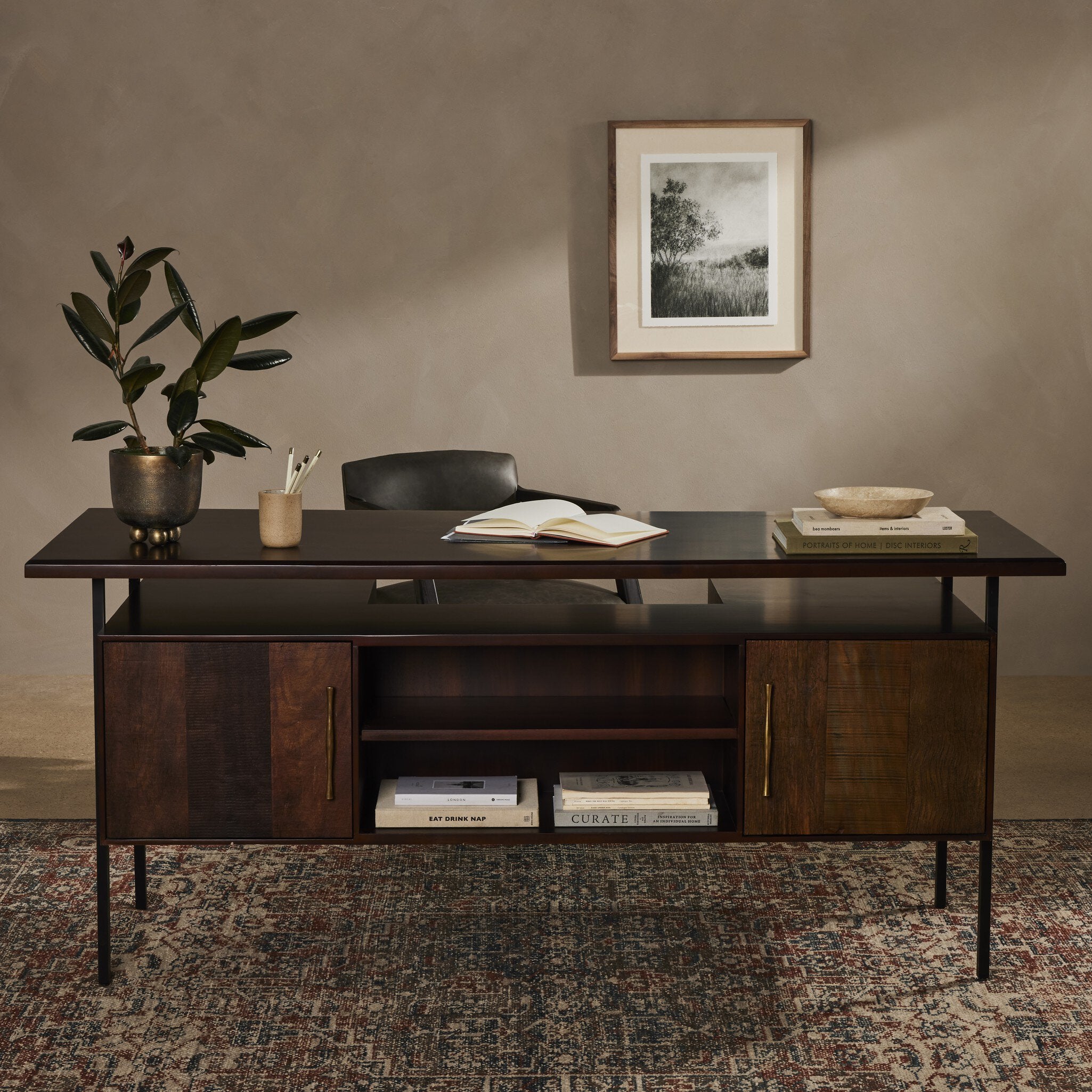 This mid-century inspired lawyer's desk offers heavy-duty storage with two-sided cabinetry. A floating top and simple iron legs keeps the look light and modern. Solid acacia casing with reclaimed peroba wood door and drawer fronts. This piece is designed in collaboration with Thomas Bina. Four Hands’ partnership with the renowned Los Angeles furniture designer began in the early 2000s, producing several unique collections including reclaimed wood-driven case goods and Brazilian-inspired upholstery.