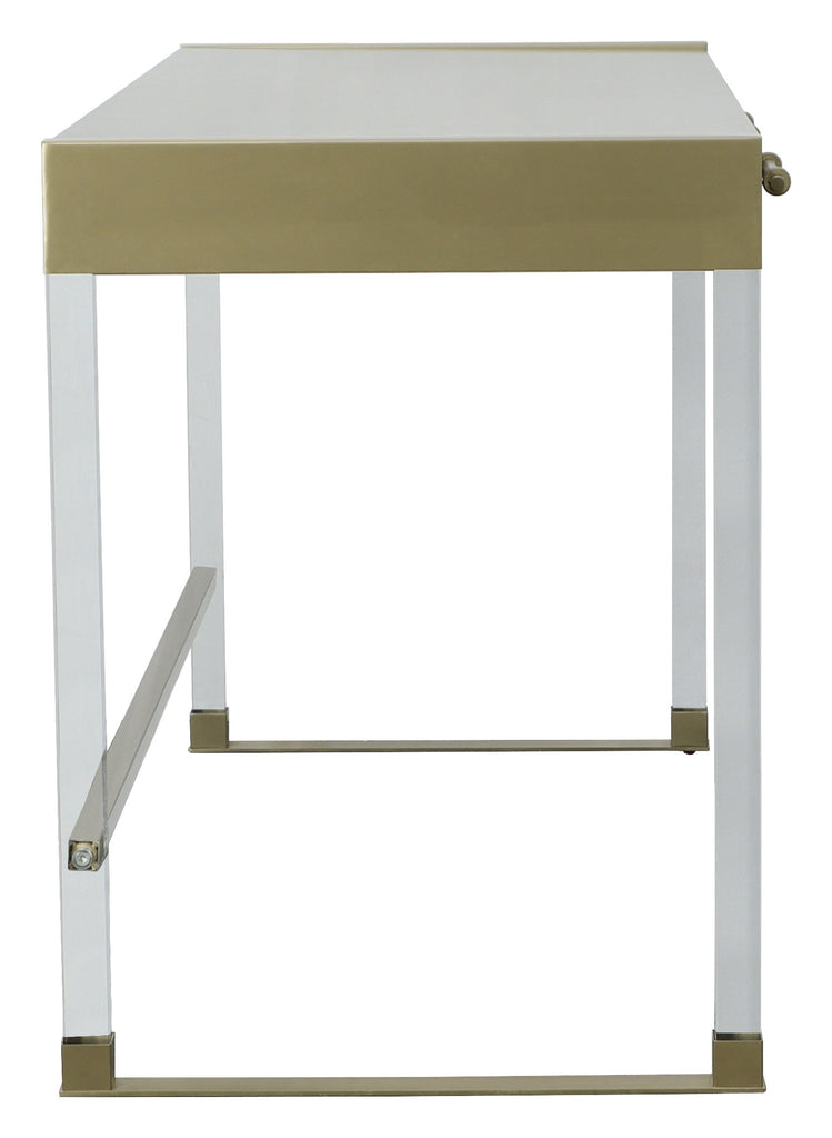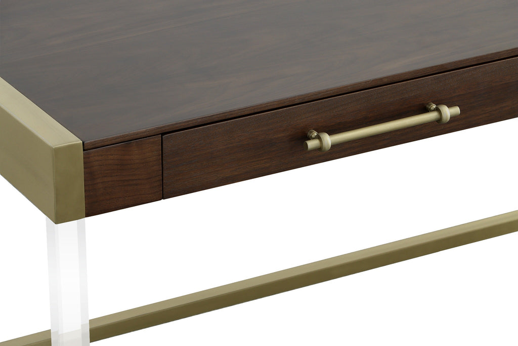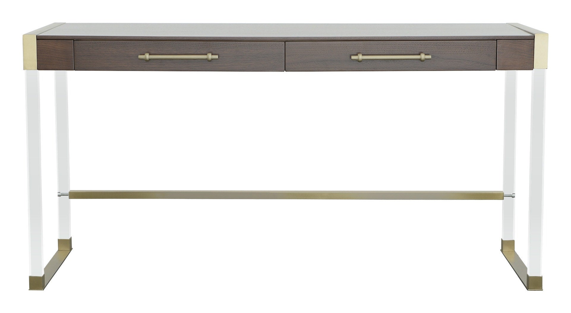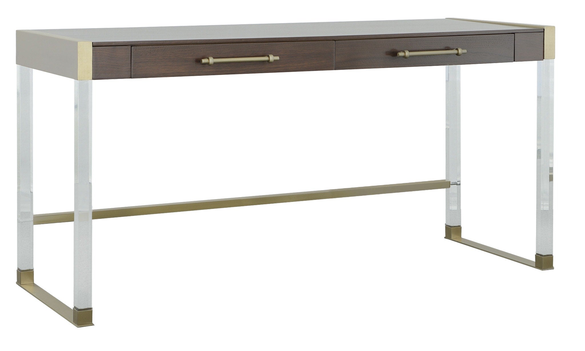 This desk combines acrylic, wood, and brass to elevate the look of this piece by mixing materials. There's great contrast between the Smoked Stone wood finish and the subtle champagne brass metal detail and hardware. The plexi legs keep it feeling open and light and, because it's only 22" deep, it can easily work as a console or a desk, making it versatile and stylish.