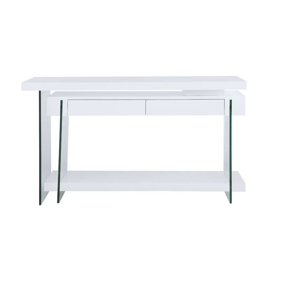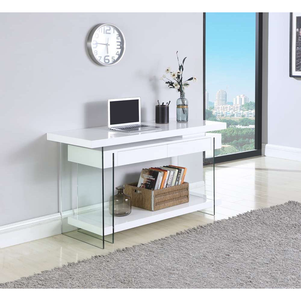 This rotating modern desk combines 1/2"-thick clear, tempered glass and a high-gloss white finish with three shelves and three drawers. It can rotate into a right or left "L" shape or fold together, nesting the storage unit under the desk.