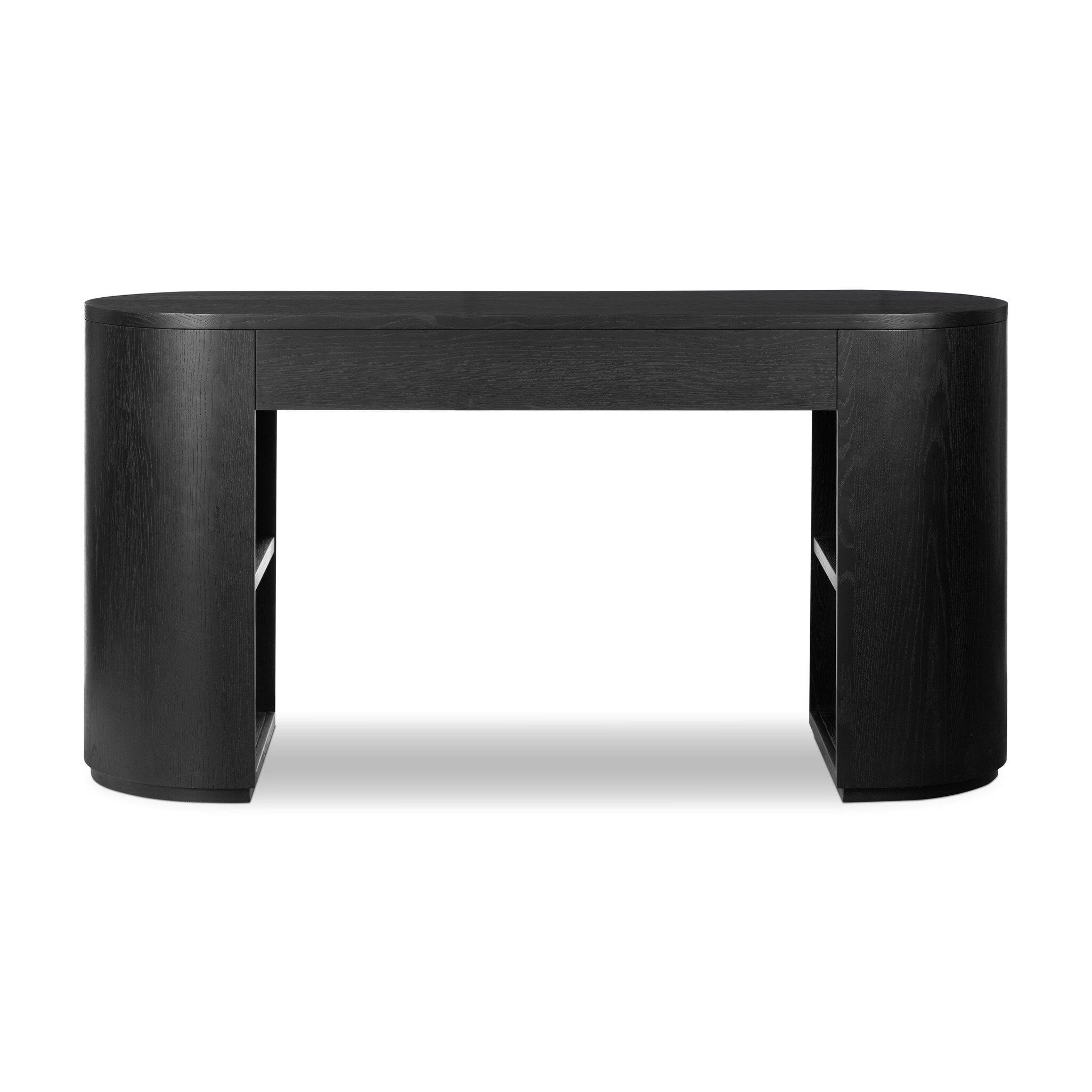 Finished in brushed ebony, solid oak veneers form a pill-inspired shape in a nod to Eighties-era design. Half-cylinder bases feature open interior shelving, with two top pencil drawers to keep supplies handy.