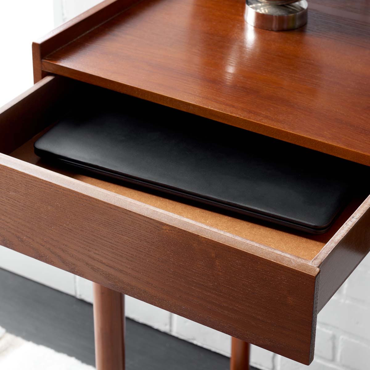 A study in form and function, this Henley Desk is in a class of its own. Mid-Century tapered legs in a warm brown finish bring rich classic-contemporary charm to any home workspace, while two slim drawers are ideal for documents and other office supplies.