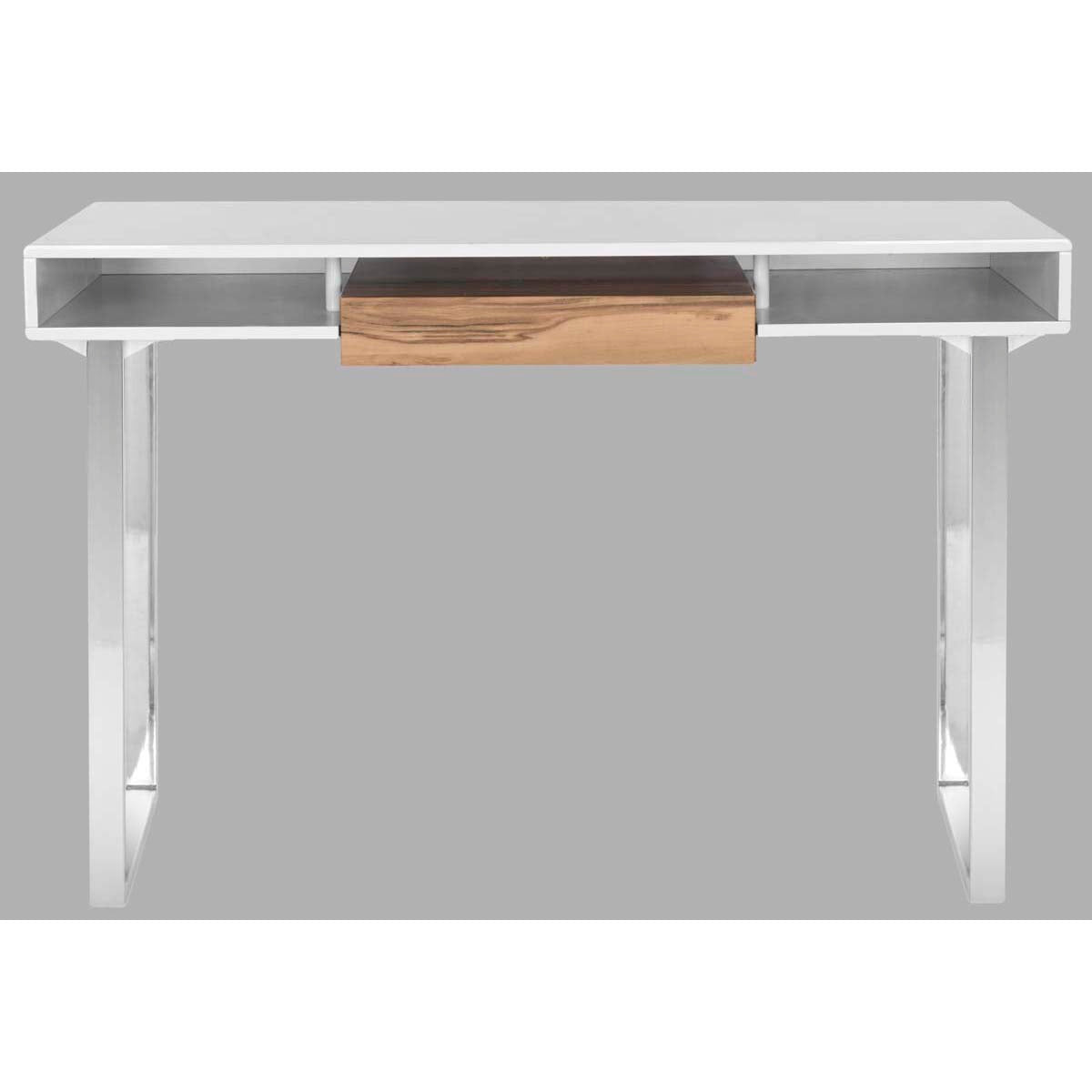 Essential clean lines and a slender form make a refined statement in the contemporary Emma writing desk. A polished steel frame serves as an elegant counterpoint to the white lacquer top and wood finished desk drawer for stashing office essentials.