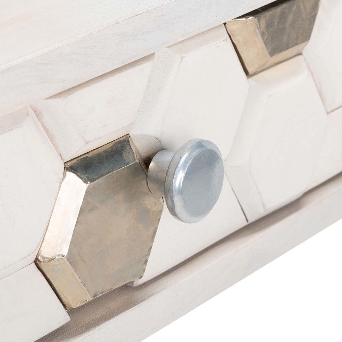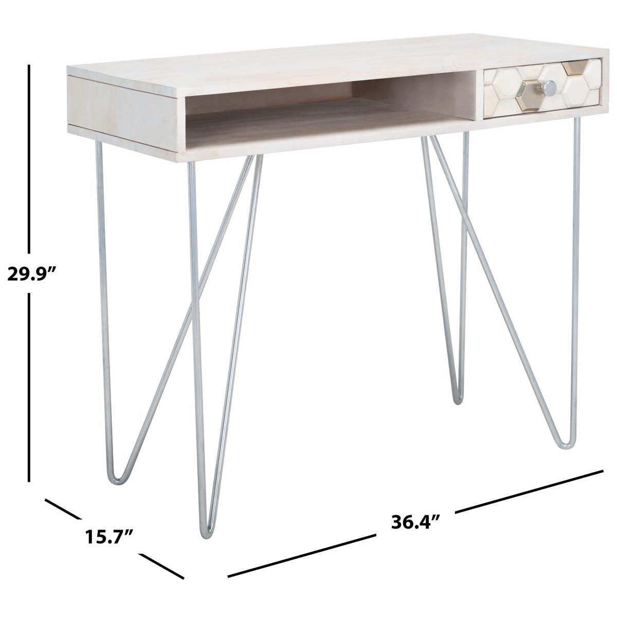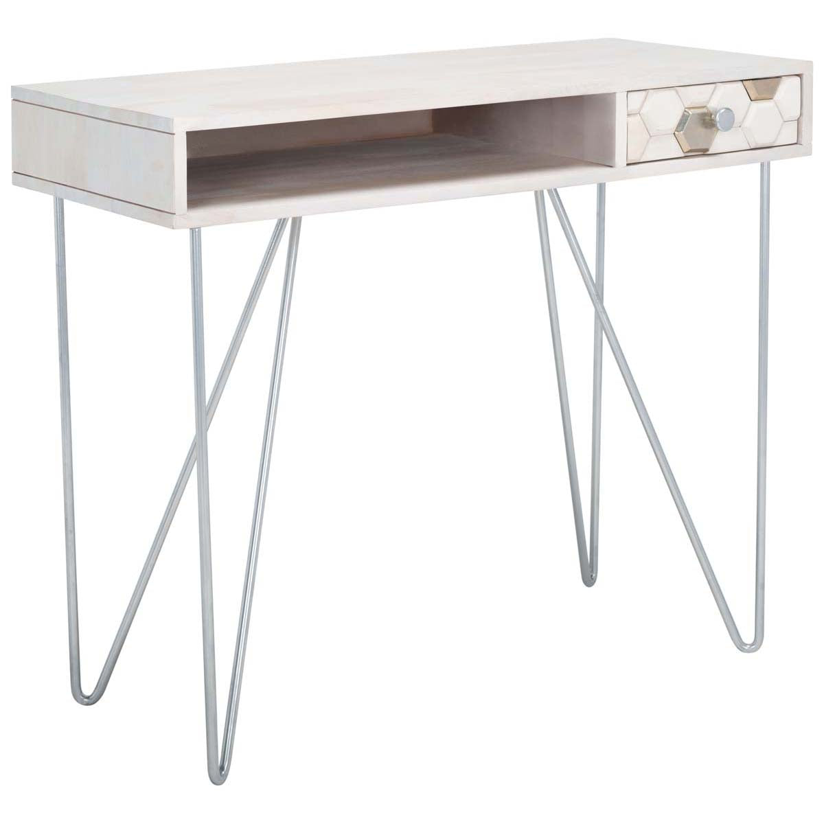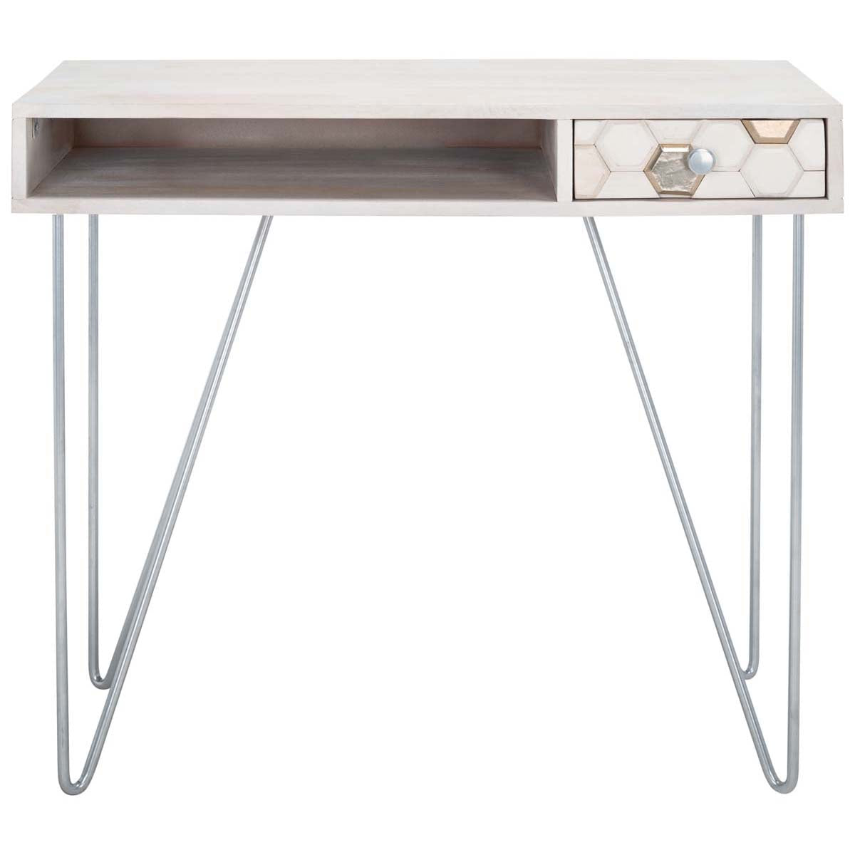 Make a bold style statement with this stunning Raveena Desk. Raveena's whitewash finish and asymmetric top is given a glamorous touch with a captivating, carved honeycomb pattern, glamorously highlighted with silver details that beautifully pair with matching hairpin legs.
