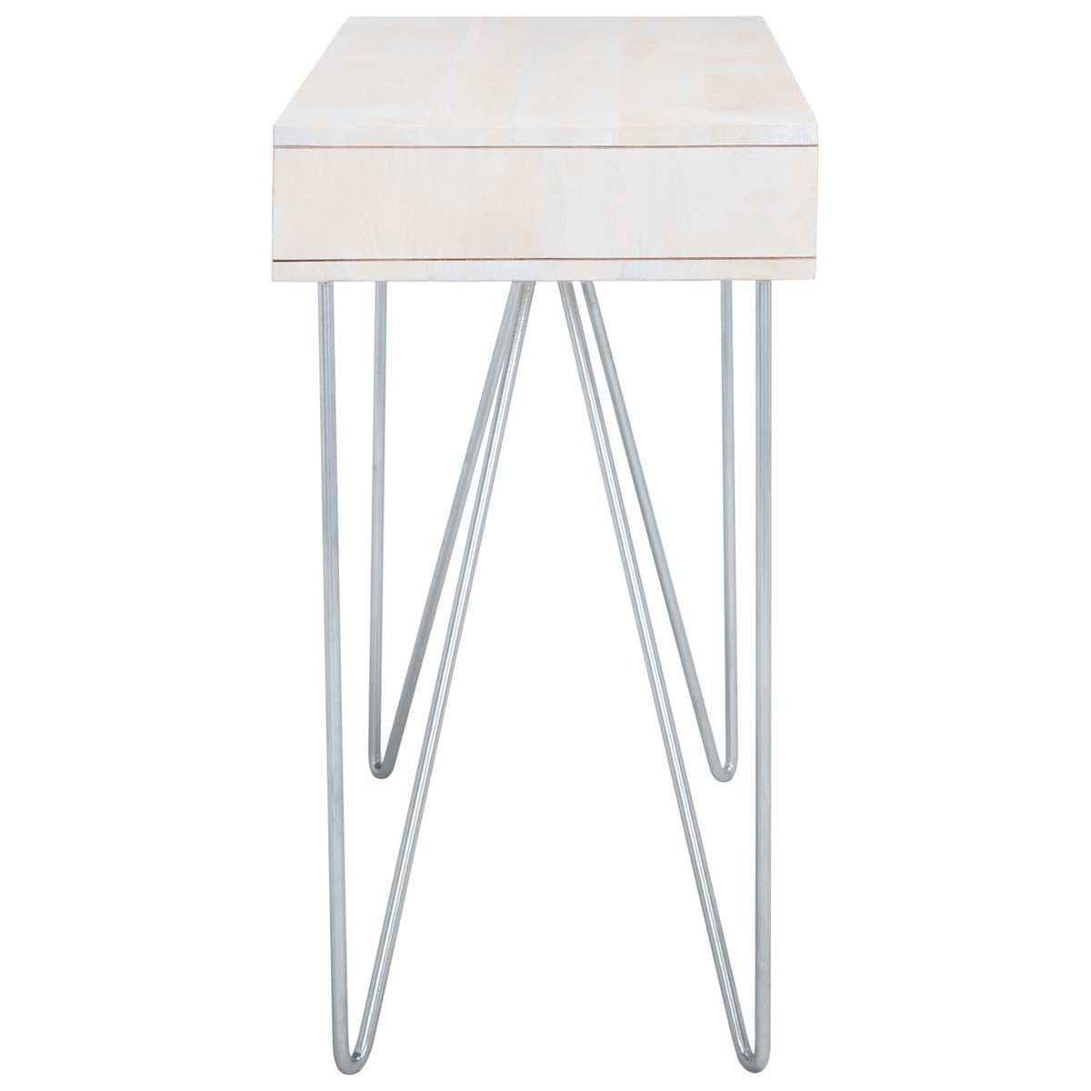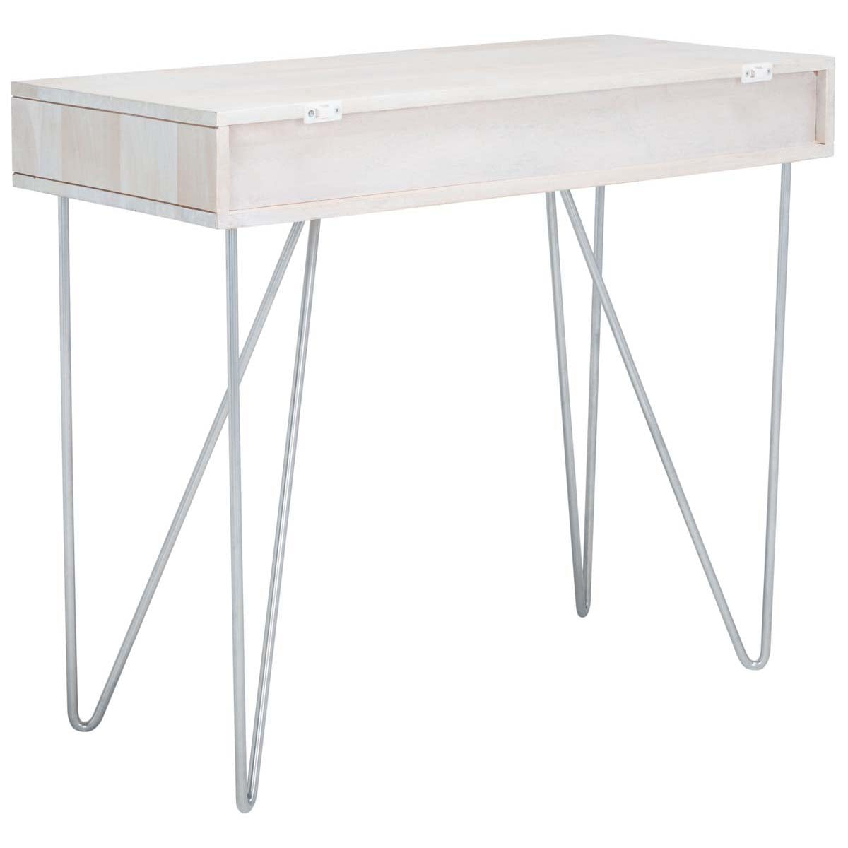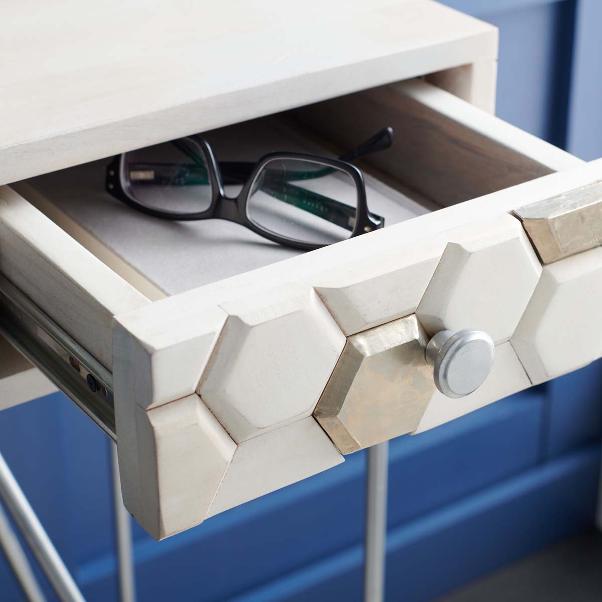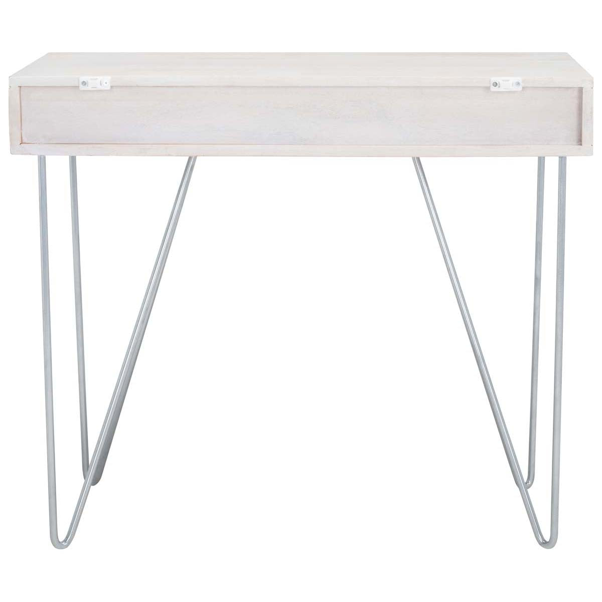 Make a bold style statement with this stunning Raveena Desk. Raveena's whitewash finish and asymmetric top is given a glamorous touch with a captivating, carved honeycomb pattern, glamorously highlighted with silver details that beautifully pair with matching hairpin legs.