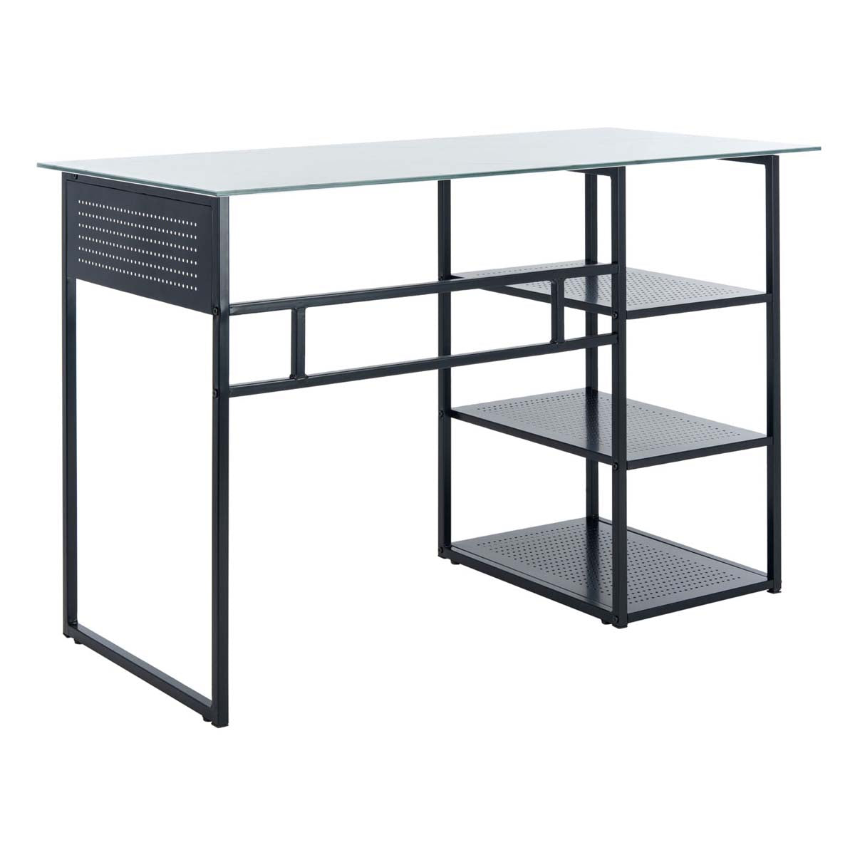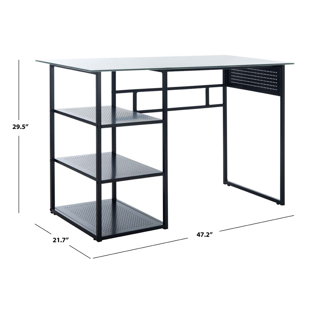 Spacious and smart, this 3 shelf glass top desk transforms any home office with its blend of form and function. Designed with a smooth white glass top, Xyla's industrial mod black metal tube frame creates three open shelves for ample storage.