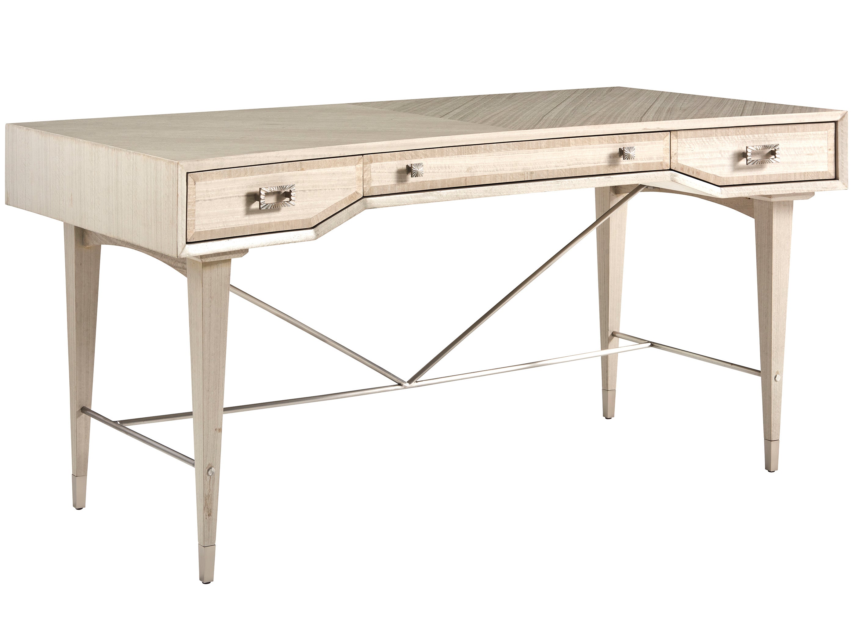 Featuring a soft concave shape and Eucalyptus veneers in a dove gray finish, the Westport writing desk conveys a fresh contemporary look. Custom hardware, decorative stretchers, and metal ferrules on the legs are all finished in brushed nickel. Three drawers offer ample storage, with the left and right facing drawers having built-in dividers.