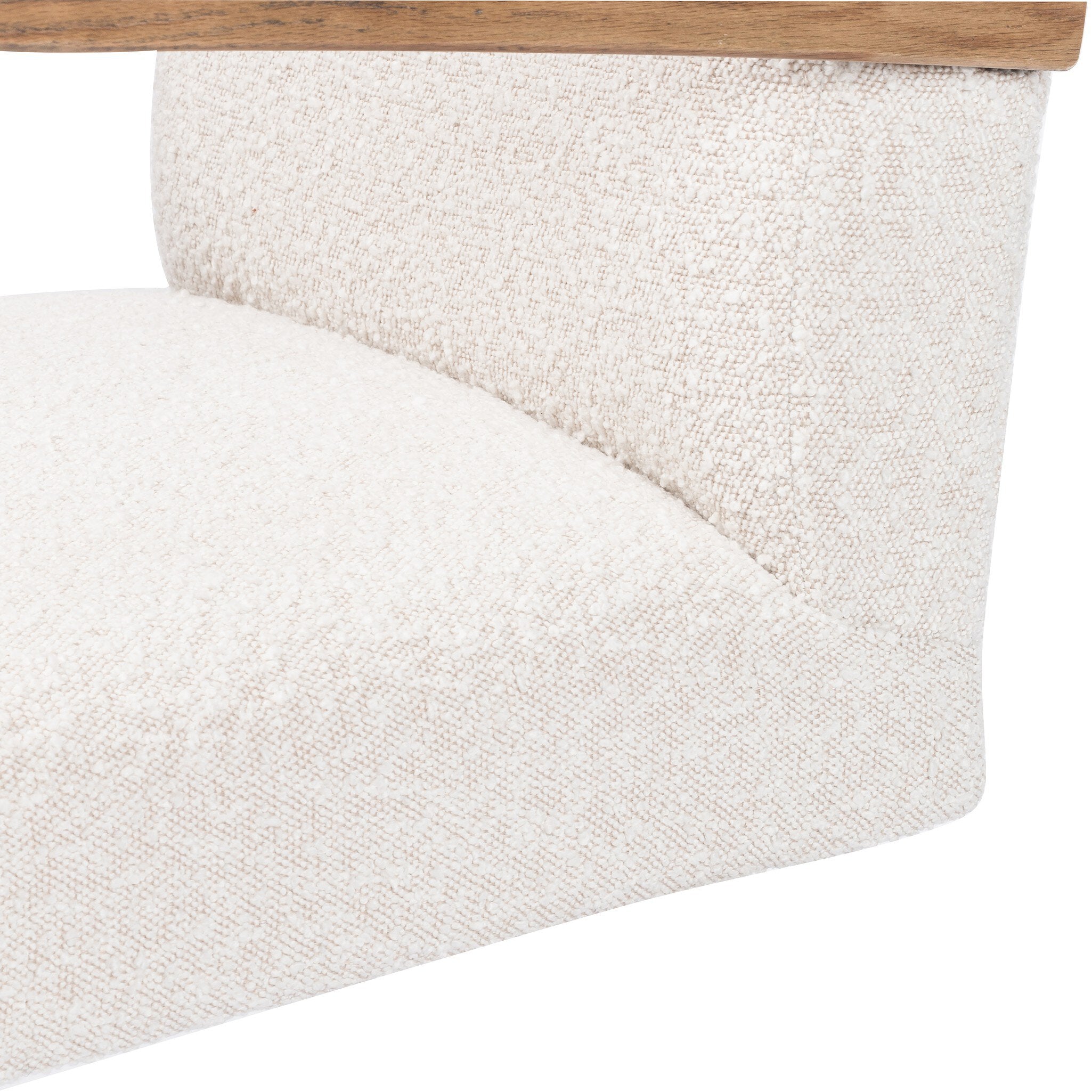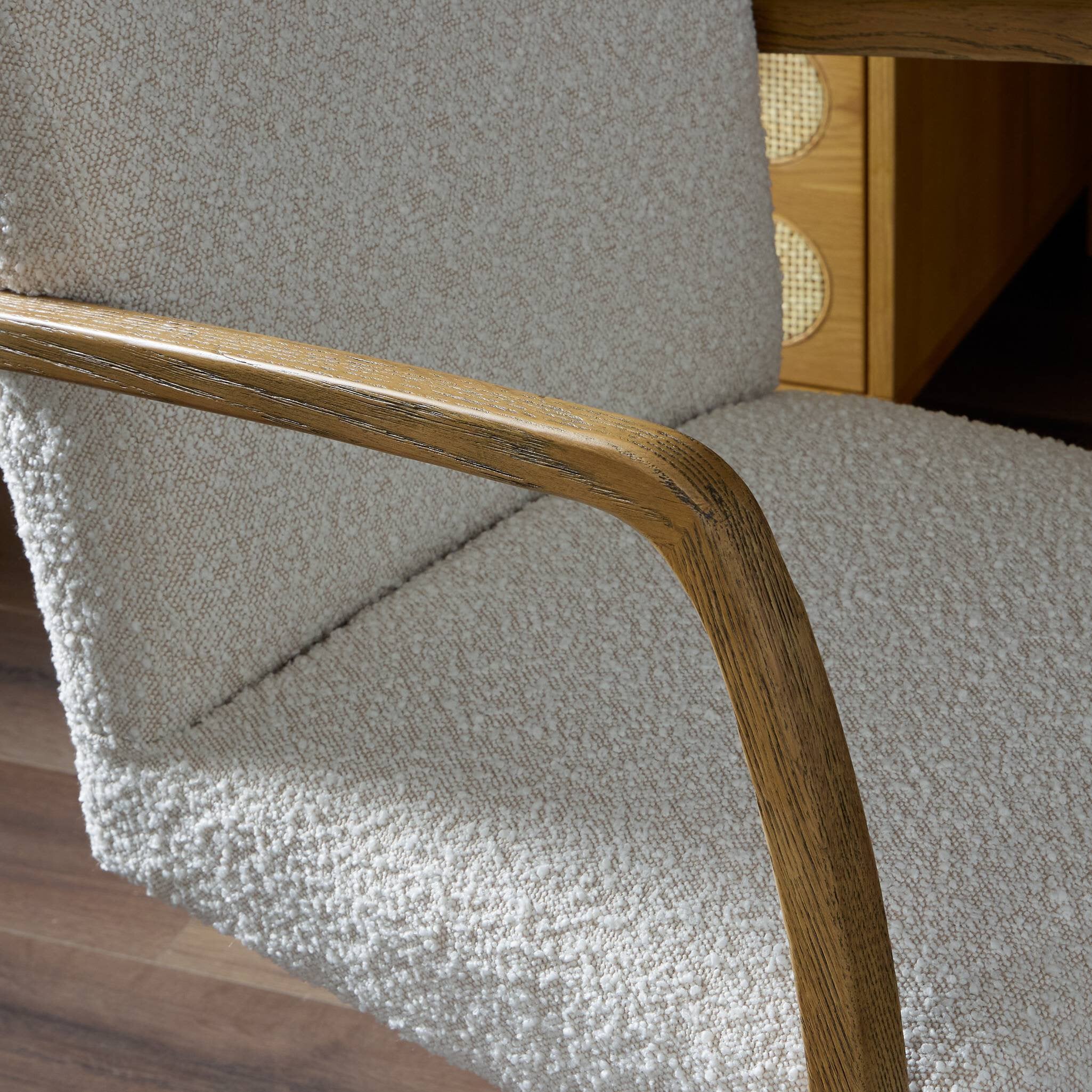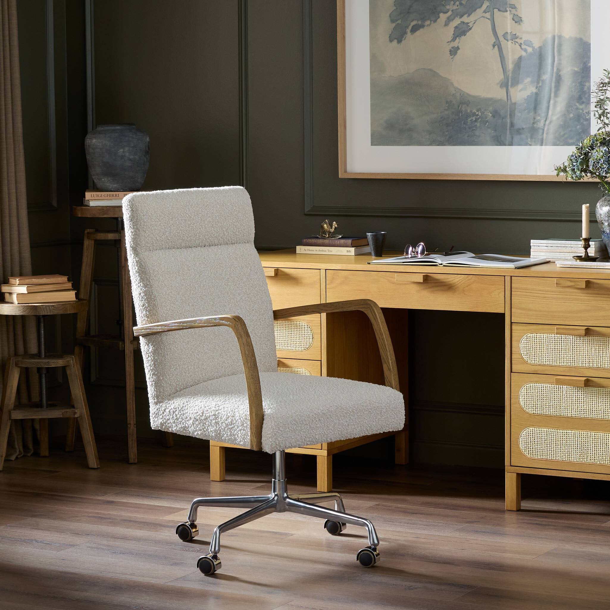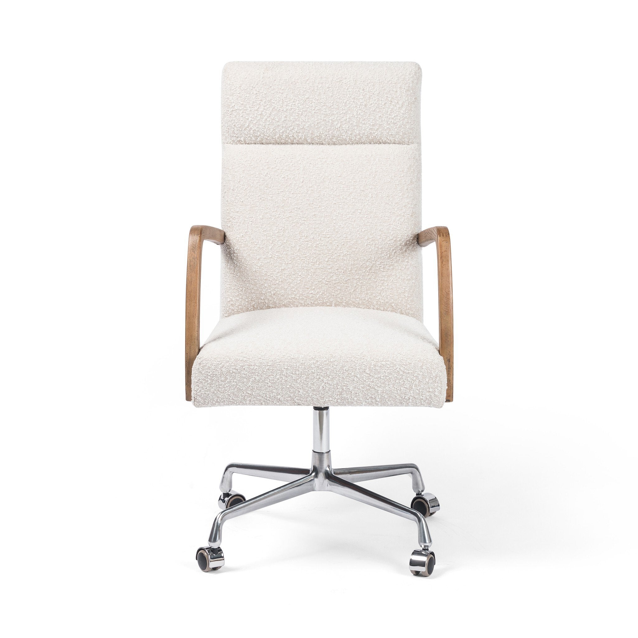 High style. Creamy white boucle-like upholstery shapes sculpted seat and back which seem to float between elegantly arched arms of distressed nettlewood. Metal casters make for ease in the workplace. Height not adjustable.