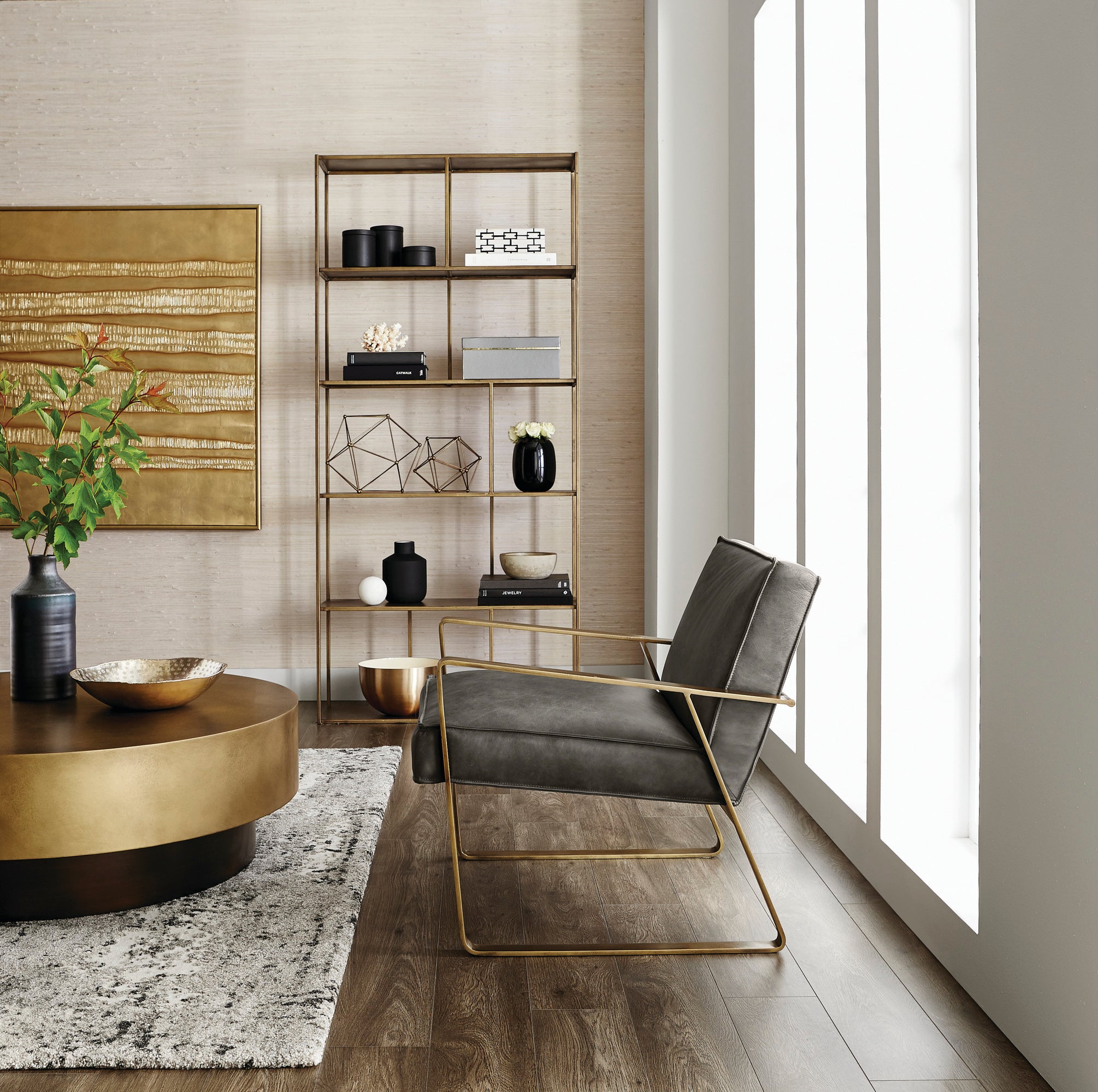 Add style and warmth to living and office spaces with this well-designed iron bookcase in a brushed antique brass finish. Can be placed in pairs or multiples for added impact and functionality. Anti-tipping kit included.