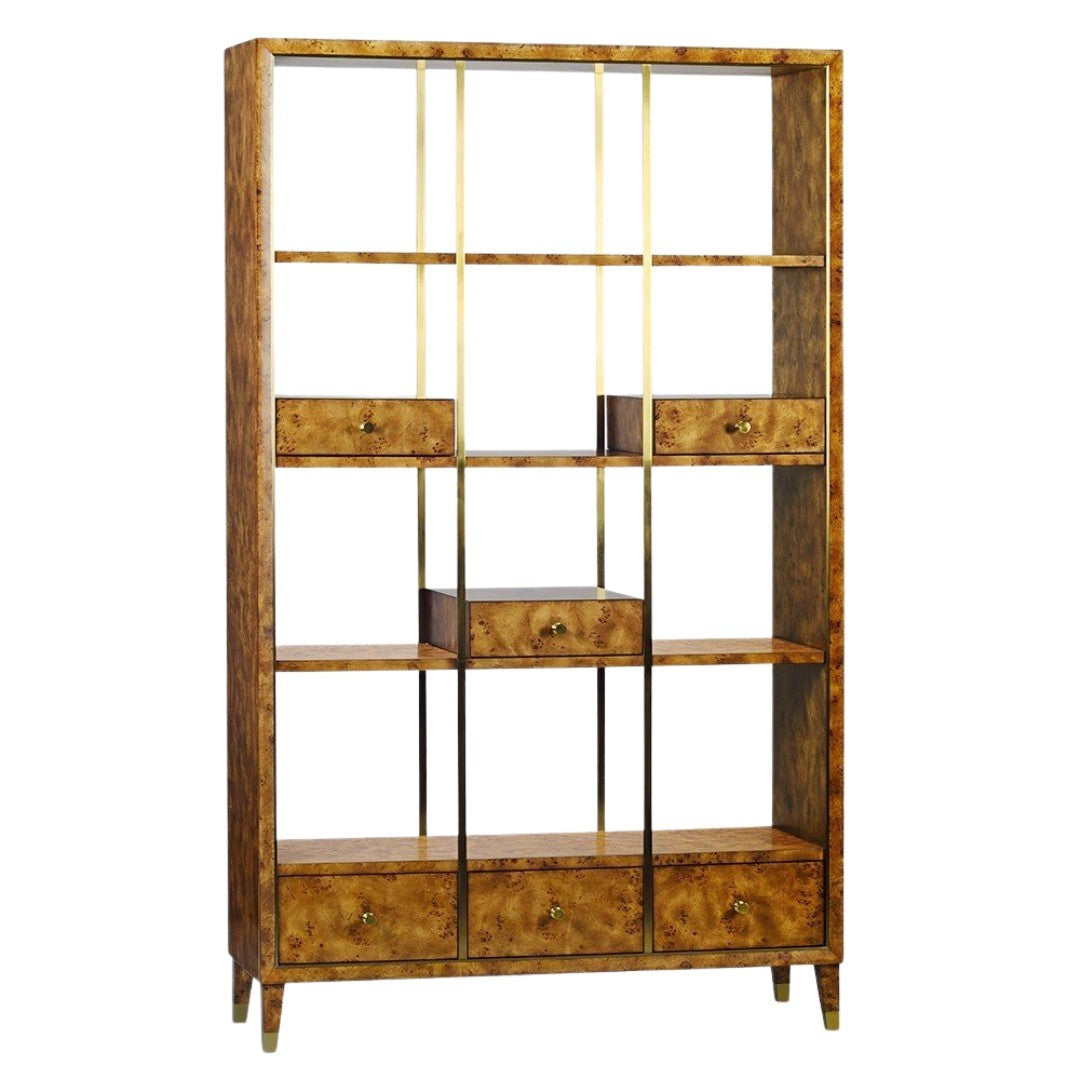 Our Harris Bookshelf features an open front with a beveled front face trim, decorative brass uprights, three lower stationery drawers and three movable drawers, all with brass turned knobs