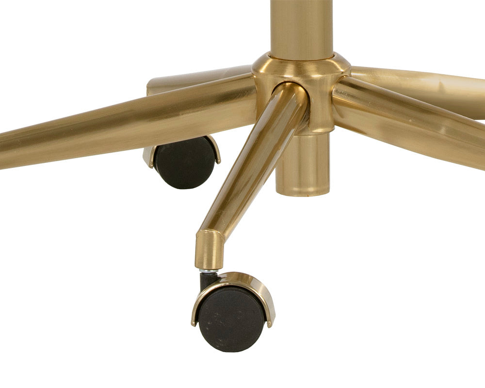 Create a stylish and functional workspace with this stunning modern office chair. Stocked in snow faux leather and features generously padded seating for optimal comfort. Completed with castors for added mobility and a gold stainless steel frame. Handle With Care: This design has been crafted with faux leather. Faux leather is manufactured to reflect the natural characteristics of leather; as such, colour variations, markings wrinkles, grooves, and light scratches are appreciated characteristics. No two pieces will be alike. Visit our Product Care page for more information on how to ensure the lasting beauty of this piece.