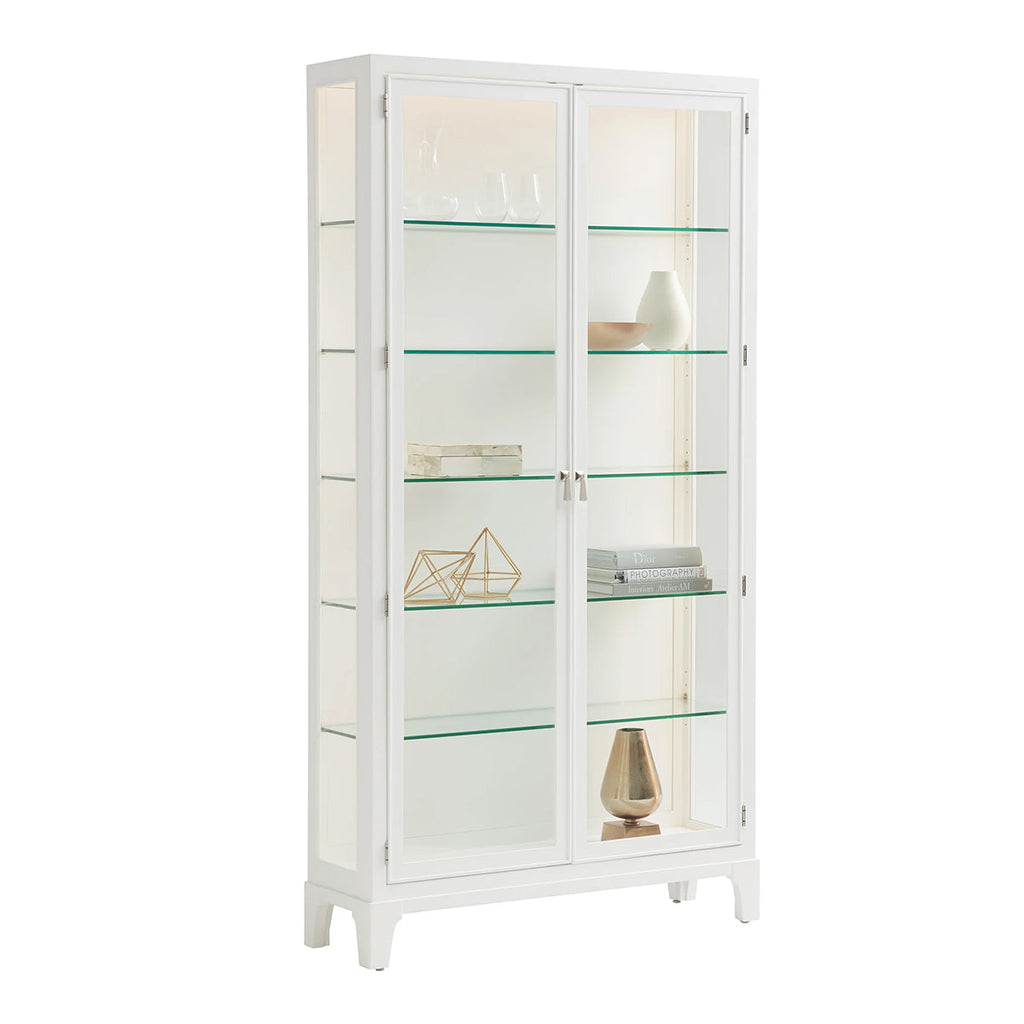 Scaled at 49-inches wide and 92-inches tall, the Lakeshore curio makes a significant design statement as a single unit or in pairs. The piece has tempered glass doors, glass end panels, and five adjustable tempered glass shelves. Dimmable touch LED lighting strips on the top and sides of the piece serve to highlight the contents behind the glass, making it the perfect anchor item for any room.